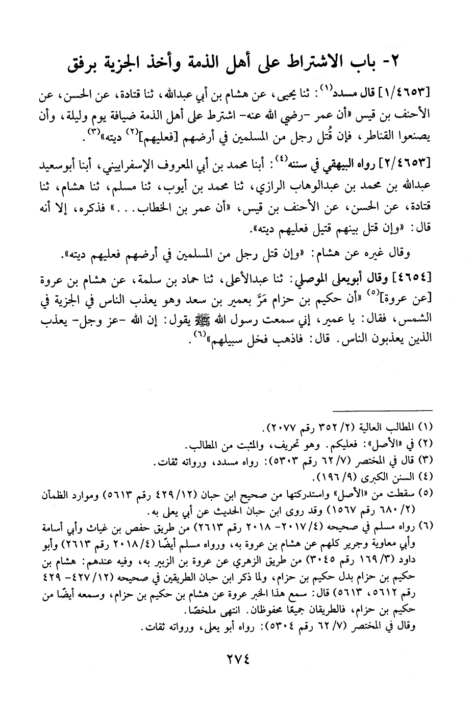 4653 / 1 - قَالَ مُسَدَّدٌ: ثَنَا يَحْيَى، عَنْ هِشَامِ بْنِ أَبِي عَبْدِ اللَّهِ، ثَنَا قَتَادَةُ، عَنِ الْحَسَنِ، عَنِ الْأَحْنَفِ بْنِ قَيْسٍ "أَنَّ عُمَرَ- رَضِيَ اللَّهُ عَنْهُ- اشْتَرَطَ عَلَى أَهْلِ الذِّمَّةِ ضِيَافَةَ يَوْمٍ وَلَيْلَةٍ، وَأَنْ يَصْنَعُوا الْقَنَاطِرَ، فَإِنْ قُتل رَجُلٌ مِنَ الْمُسْلِمِينَ فِي أَرْضِهِمْ فَعَلَيْهِمْ ديته ".