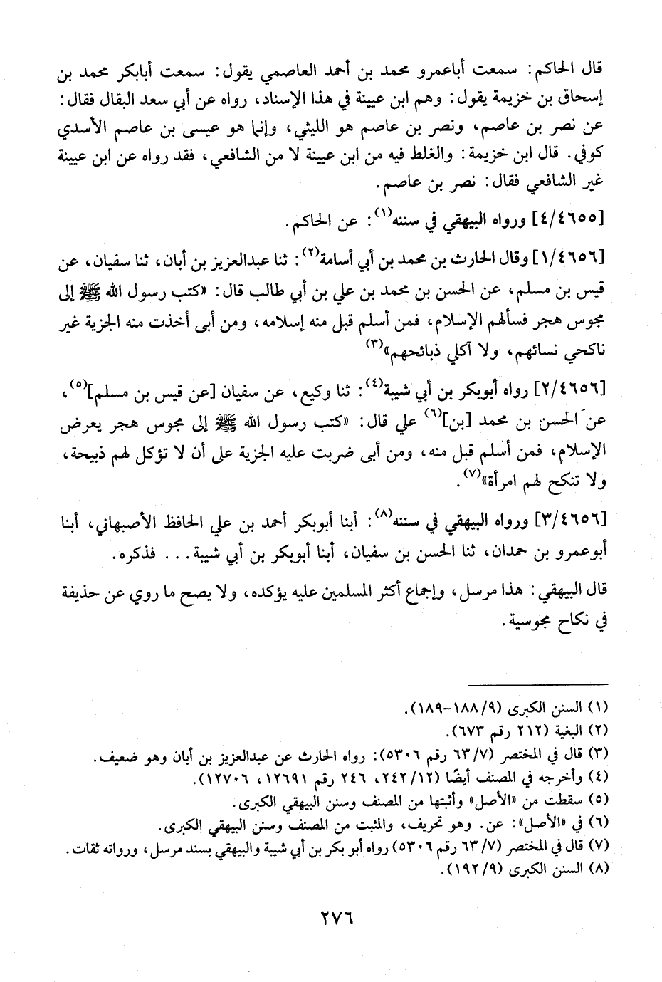 قَالَ الْبَيْهَقِيُّ: هَذَا مُرْسَلٌ، وَإِجْمَاعُ أَكْثَرِ الْمُسْلِمِينَ عَلَيْهِ يُؤَكِّدُهُ، وَلَا يَصِحُّ مَا رُوِيَ عَنْ حُذَيْفَةَ فِي نِكَاحِ مَجُوسِيَّةٍ.