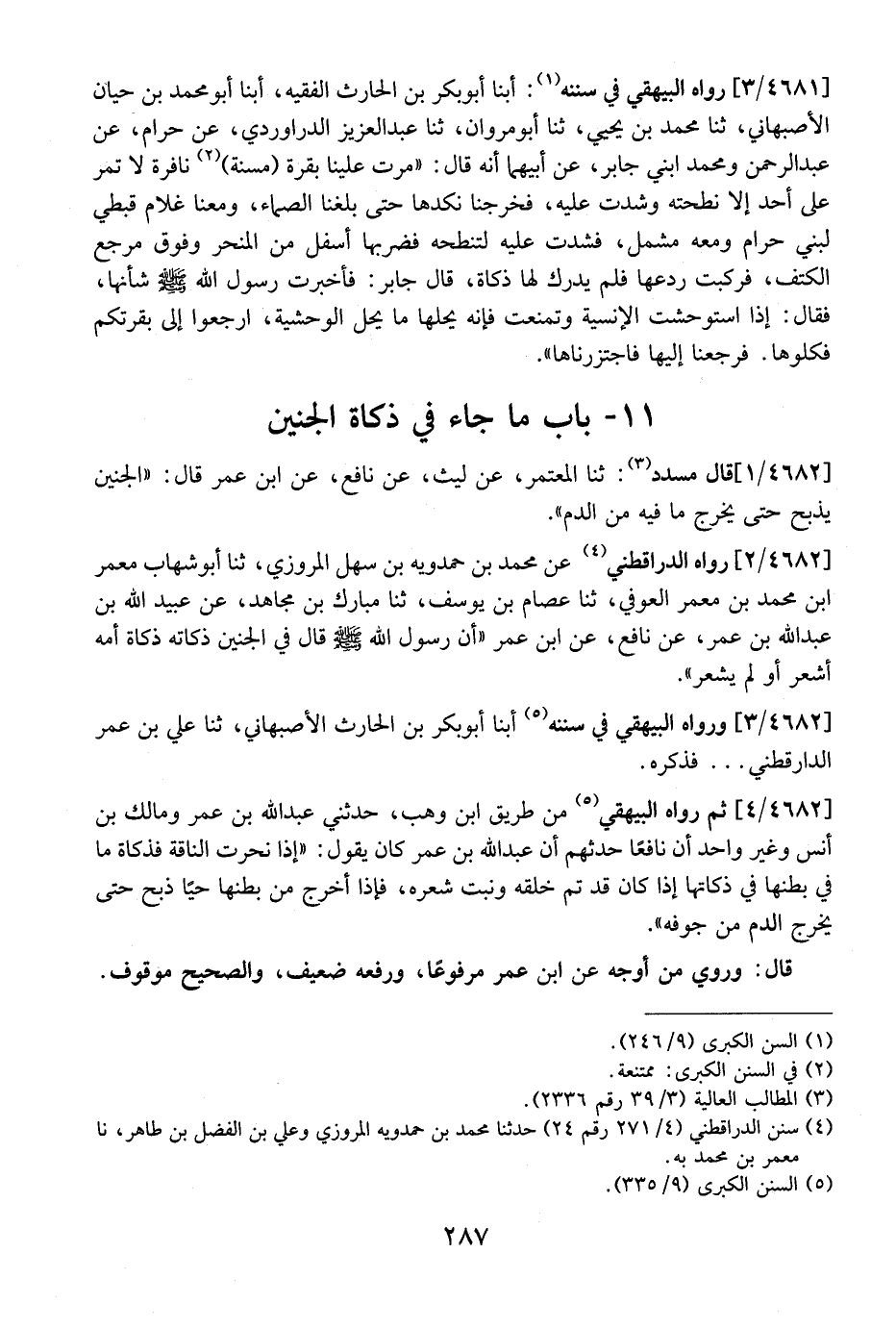 4682 / 4 - ثُمَّ رَوَاهُ الْبَيْهَقِيُّ مِنْ طَرِيقِ ابْنِ وَهْبٍ، حَدَّثَنِي عَبْدُ اللَّهِ بْنُ عُمَرَ وَمَالِكُ بْنُ أَنَسٍ وَغَيْرُ وَاحِدٍ أَنَّ نَافِعًا حَدَّثَهُمْ أَنَّ عَبْدَ اللَّهِ بْنَ عُمَرَ كَانَ يَقُولُ: "إِذَا نُحِرَتِ النَّاقَةُ فَذَكَاةُ مَا فِي بَطْنِهَا فِي ذَكَاتِهَا إِذَا كَانَ قَدْ تَمَّ خَلْقُهُ ونبت شعره، فإذا أخرج من بطنها حيًا ذبح حتى يخرص الدَّمُ مِنْ جَوْفِهِ ".