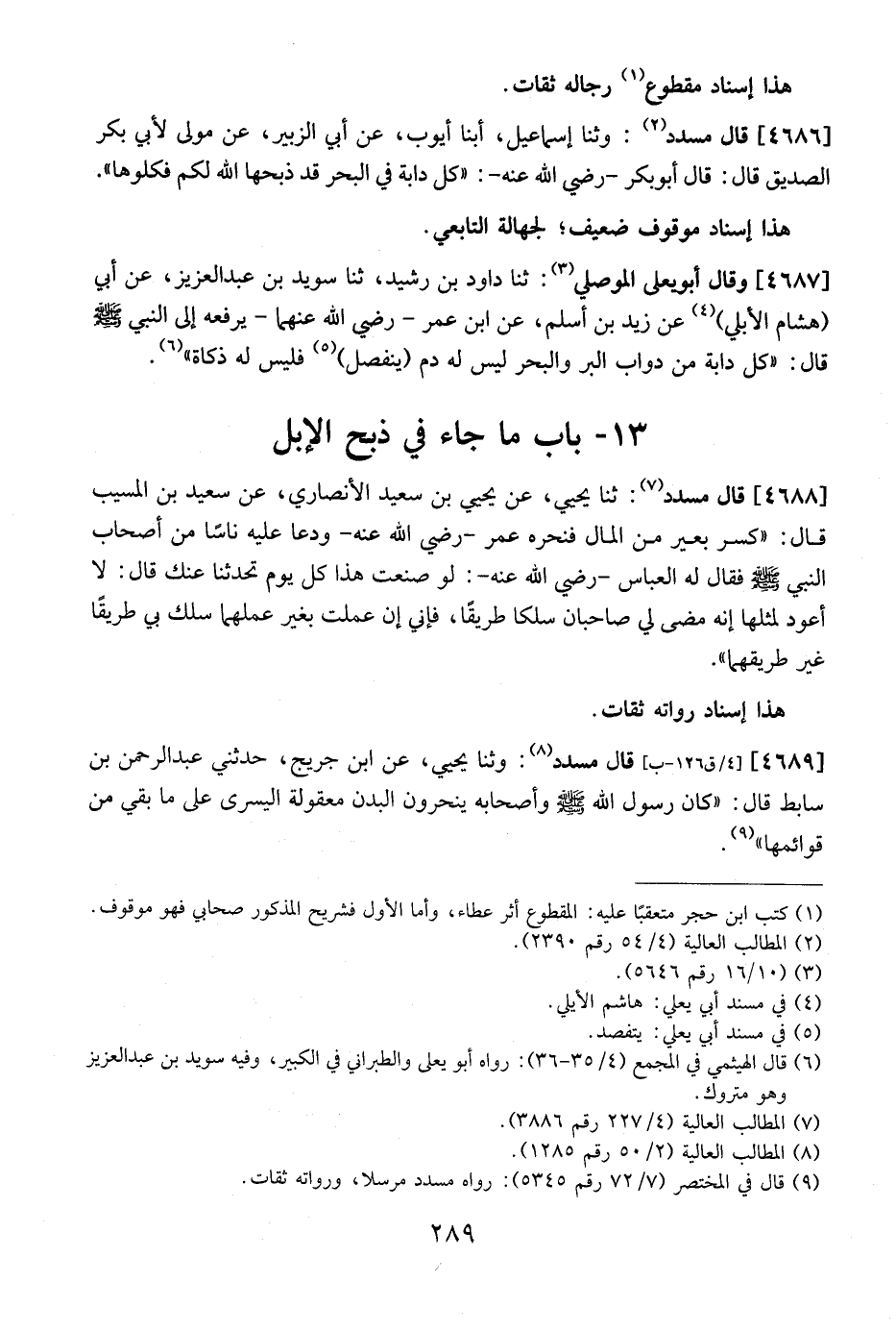 4686 - قَالَ مُسَدَّدٌ: وثنا إسماعيل، أبنا أَيُّوبُ، عَنْ أَبِي الزُّبَيْرِ، عَنْ مَوْلًى لِأَبِي بَكْرٍ الصِّدِّيقِ قَالَ: قَالَ أَبُو بَكْرٍ- رَضِيَ اللَّهُ عَنْهُ-: "كُلُّ دَابَّةٍ فِي الْبَحْرِ قَدْ ذَبَحَهَا اللَّهُ لَكُمْ فَكُلُوهَا". هَذَا إِسْنَادٌ مَوْقُوفٌ ضَعِيفٌ؟ لِجَهَالَةِ التَّابِعِيِّ.