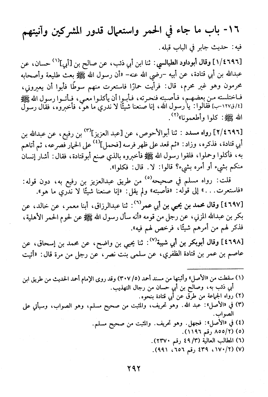 4696 / 2 - رَوَاهُ مُسَدَّدٌ: ثَنَا أَبُو الأحوص، عَنْ عَبْدِ الْعَزِيزِ بْنِ رُفَيْعٍ، عَنْ عَبْدِ اللَّهِ بْنِ أَبِي قَتَادَةَ، فَذَكَرَهُ، وَزَادَ: "ثُمَّ قَعَدَ عَلَى ظَهْرِ فَرَسِهِ فَحَمَلَ عَلَى الْحِمَارِ فَصَرَعَهُ، ثُمَّ أَتَاهُمْ بِهِ، فَأَكَلُوا وَحَمَلُوا، فَلَقُوا رَسُولِ اللَّهِ - صَلَّى اللَّهُ عَلَيْهِ وَسَلَّمَ - فَأَخْبَرُوهُ بِالَّذِي صَنَعَ أَبُو قَتَادَةَ، فَقَالَ: أَشَارَ إِنْسَانٌ مِنْكُمْ بِشَيْءٍ أَوْ أَمَرَهُ بِشَيْءٍ؟ قَالُوا: لَا. قَالَ: فَكُلُوا".