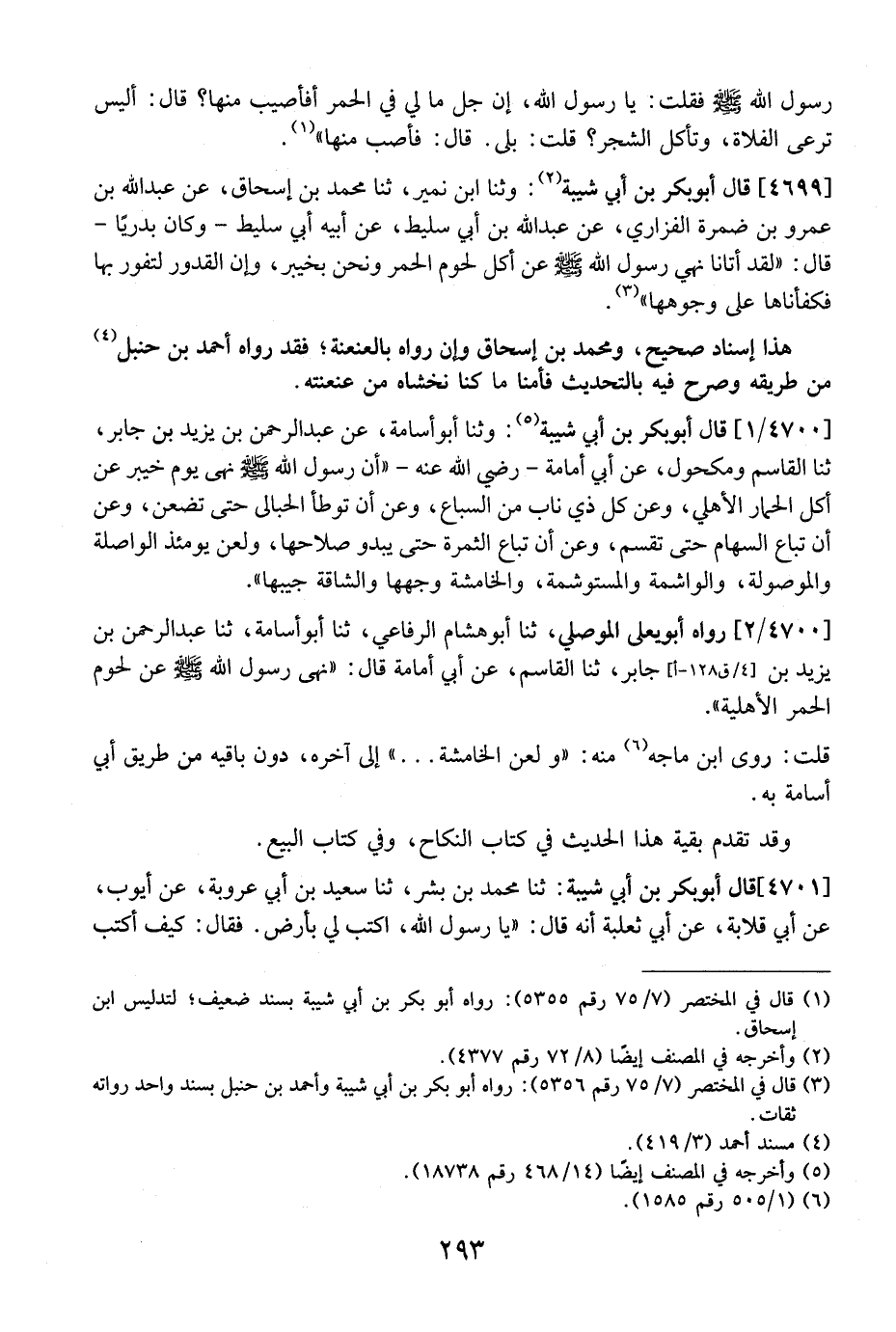 4700 / 1 - قَالَ أَبُو بَكْرِ بْنُ أَبِي شَيْبَةَ: وَثَنَا أَبُو أُسَامَةَ، عَنْ عَبْدِ الرَّحْمَنِ بْنِ يَزِيدَ بْنِ جَابِرٍ، ثَنَا الْقَاسِمُ وَمَكْحُولٌ، عَنْ أَبِي أُمَامَةَ- رَضِيَ اللَّهُ عَنْهُ- "أَنَّ رَسُولَ اللَّهِ - صلى الله عليه وسلم - نهى يَوْمَ خَيْبَرَ عَنْ أَكْلِ الْحِمَارِ الْأَهْلِيِّ، وَعَنْ كُلِّ ذِي نَابٍ مِنَ السِّبَاعِ، وَعَنْ أَنْ توطأ الحبالى حتى تضعن، وَعَنْ أَنْ تُبَاعَ السِّهَامُ حَتَّى تُقَسَّمَ، وَعَنْ أَنْ تُبَاعَ الثَّمَرَةُ حَتَّى يَبْدُوَ صَلَاحُهَا، وَلَعَنَ يَوْمَئِذٍ الْوَاصِلَةَ وَالْمَوْصُولَةَ، وَالْوَاشِمَةَ وَالْمُسْتَوْشِمَةَ، وَالْخَامِشَةَ وَجْهَهَا وَالشَّاقَّةَ جَيْبَهَا".
