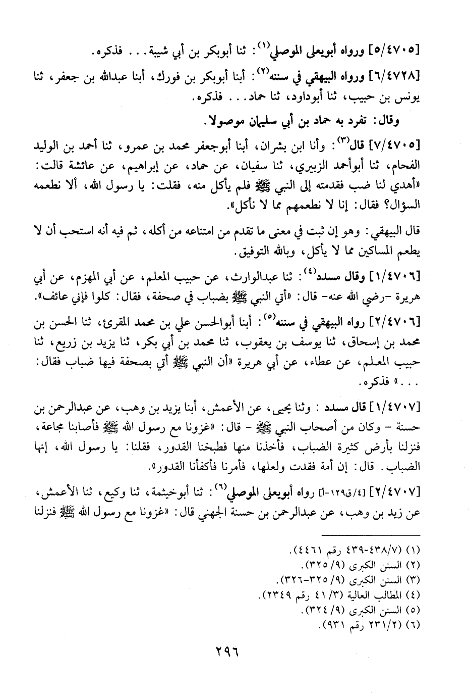 4706 / 2 - وواه البيهقي وسننه: أبنا أَبُو الْحَسَنِ عَلِيُّ بْنُ مُحَمَّدٍ الْمُقْرِئ، ثَنَا الْحَسَنُ بْنُ مُحَمَّدِ بْنِ إِسْحَاقَ، ثَنَا يُوسُفُ بْنُ يَعْقُوبَ، ثَنَا مُحَمَّدُ بْنُ أَبِي بَكْرٍ، ثَنَا يَزِيدُ بْنُ زُرَيْعٍ، ثَنَا حَبِيبٌ الْمُعَلِّمُ، عَنْ عَطَاءٍ، عَنْ أَبِي هُرَيْرَةَ "أَنّ النَّبِيَّ - صَلَّى اللَّهُ عَلَيْهِ وَسَلَّمَ - أُتِيَ بِصَحْفَةٍ فِيهَا ضِبَابٌ فَقَالَ: ... " فَذَكَرَهُ.