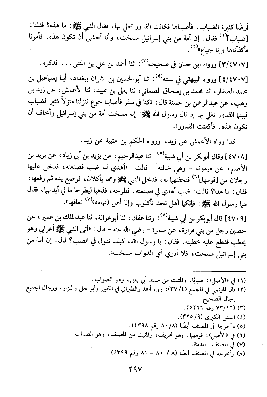 4707 / 4 - وَرَوَاهُ الْبَيْهَقِيُّ فِي سُنَنِهِ: ثنا أَبُو الحسين بن بشران ببغداد، أبنا إِسْمَاعِيلُ بْنُ مُحَمَّدٍ الصَّفَّارُ، ثَنَا مُحَمَّدُ بْنُ إِسْحَاقَ الصَّغَانِيُّ، ثَنَا يَعْلَى بْنُ عُبَيْدٍ، ثَنَا الْأَعْمَشُ، عَنْ زَيْدِ بْنِ وَهْبٍ، عَنْ عَبْدِ الرَّحْمَنِ بْنِ حَسَنَةَ قَالَ: "كُنَّا فِي سَفَرٍ فَأَصَابَنَا جُوعٌ فَنَزَلْنَا مَنْزِلًا كَثِيرَ الضِّبَابِ فَبَيْنَمَا الْقُدُورُ تَغْلِي بِهَا إِذْ قَالَ رَسُولُ اللَّهِ - صَلَّى اللَّهُ عَلَيْهِ وَسَلَّمَ -: إِنَّهُ مُسِخَتْ أُمَّةٌ مِنْ بَنِي إِسْرَائِيلَ وَأَخَافُ أَنْ تَكُونَ هَذِهِ. فَأُكْفِئَتِ الْقُدُورُ".