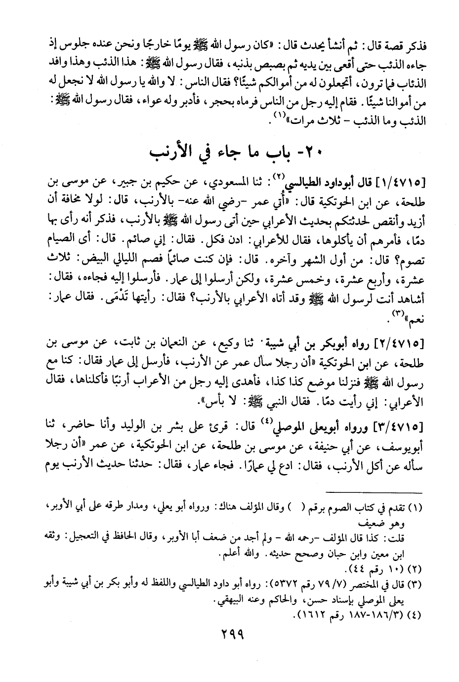 4715 / 1 - قَالَ أَبُو دَاوُدَ الطَّيَالِسِيُّ: ثَنَا الْمَسْعُودِيُّ، عَنِ حَكِيمِ بْنِ جُبَيْرٍ، عَنْ موسى بن طلحة، عن ابن الحوتكية قال: "أُتي عمر- رضي الله عنه- بالأرنب، قال: لولا نحافة أَنْ أُزِيدَ وَأَنْقِصَ لحدثتكم بِحَدِيثِ الْأَعْرَابِيِّ حِينَ أَتَى رَسُولَ اللَّهِ - صَلَّى اللَّهُ عَلَيْهِ وَسَلَّمَ - بِالْأَرْنَبِ، فَذَكَرَ أَنَّهُ رَأَى بِهَا دَمًا، فَأَمَرَهُمْ أَنْ يَأْكُلُوهَا، فَقَالَ لِلْأَعْرَابِيِّ: ادْنُ فَكُلْ. فَقَالَ: إِنِّي صَائِمٌ. قَالَ: أَيَّ الصِّيَامِ تَصُومُ؟ قَالَ: مِنْ أَوَّلِ الشَّهْرِ وَآخِرِهِ. قَالَ: فَإِنْ كُنْتَ صَائِمًا فَصُمِ الْلَيَالِيَ الْبِيضَ: ثَلَاثَ عَشْرَةَ، وَأَرْبَعَ عَشْرَةَ، وَخَمْسَ عَشْرَةَ، وَلَكِنْ أَرْسِلُوا إِلَى عَمَّارٍ. فأرسلوا إليه فجاءه، فقال: أشاهد أَنْتَ لِرَسُولِ اللَّهِ - صَلَّى اللَّهُ عَلَيْهِ وَسَلَّمَ - وَقَدْ أَتَاهُ الْأَعْرَابِيُّ بِالْأَرْنَبِ؟ فَقَالَ: رَأَيْتُهَا تَدْمَى. فَقَالَ عَمَّارٌ: نَعَمْ ".