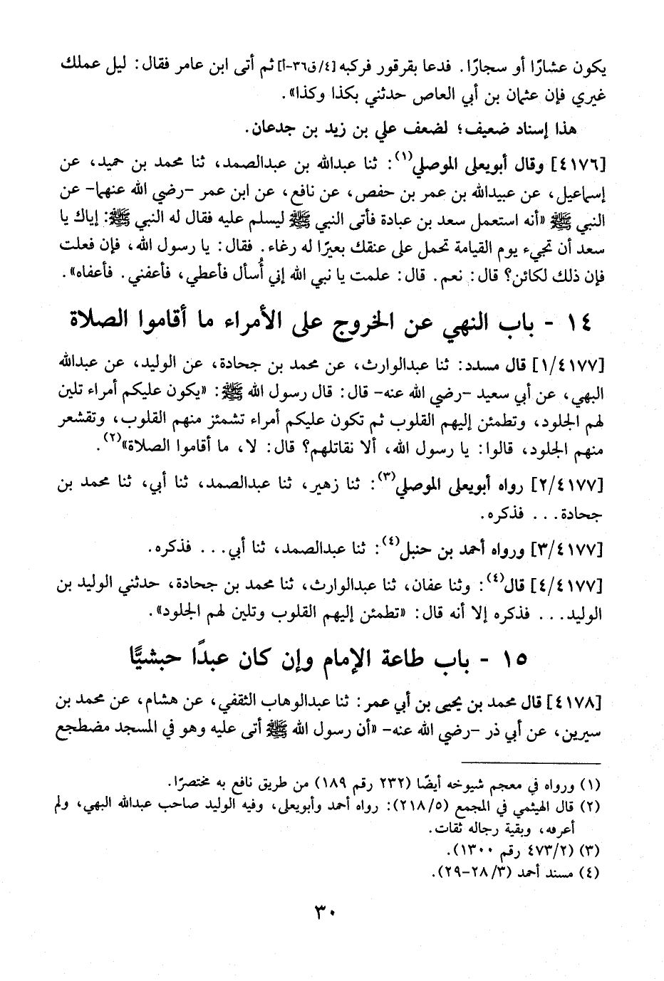 4177 / 1 - قَالَ مُسَدَّدٌ: ثَنَا عَبْدُ الْوَارِثِ، عَنْ مُحَمَّدِ بْنِ جحادة، عَنِ الْوَلِيدِ، عَنْ عَبْدِ اللَّهِ الْبَهِيِّ، عَنْ أَبِي سَعِيدٍ- رَضِيَ اللَّهُ عَنْهُ- قَالَ: قَالَ رَسُولُ اللَّهِ - صَلَّى اللَّهُ عَلَيْهِ وَسَلَّمَ - يَكُونُ عَلَيْكُمْ أُمَرَاءُ تَلِينُ لَهُمُ الْجُلُودُ، وَتَطْمَئِنُّ إِلَيْهِمُ الْقُلُوبُ ثُمَّ تَكُونُ عَلَيْكُمْ أُمَرَاءُ تَشْمَئِزُّ مِنْهُمُ الْقُلُوبُ، وَتَقْشَعِرُّ مِنْهُمُ الْجُلُودُ، قَالُوا: يَا رَسُولَ اللَّهِ - صَلَّى اللَّهُ عَلَيْهِ وَسَلَّمَ - أَلَا نُقَاتِلُهُمْ؟ قَالَ: لَا، مَا أَقَامُوا الصَّلَاةِ".