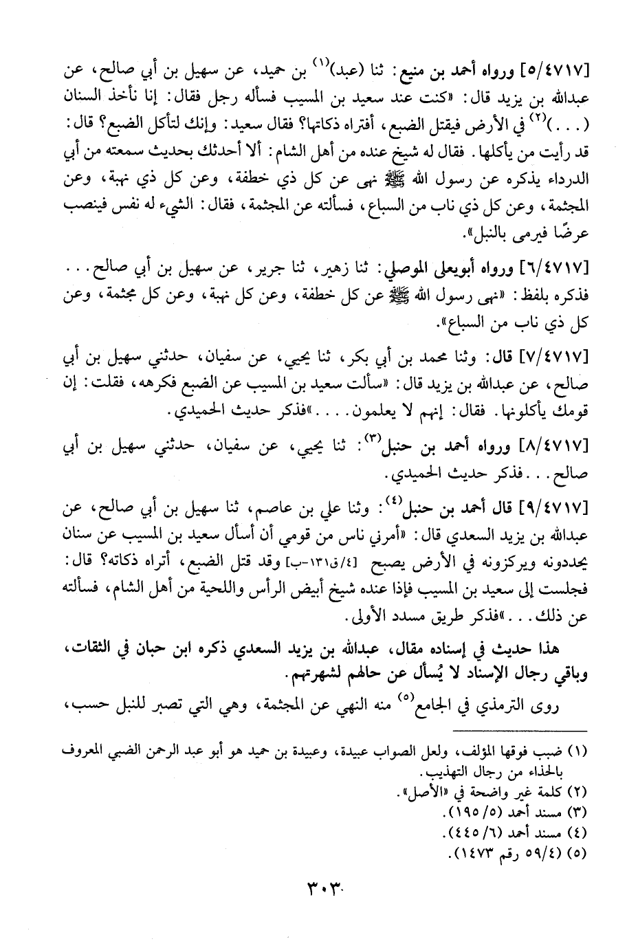 4717 / 9 - قَالَ أَحْمَدُ بْنُ حَنْبَلٍ: وَثَنَا عَلِيُّ بْنُ عَاصِمٍ، ثَنَا سُهَيْلُ بْنُ أَبِي صَالِحٍ، عَنْ عَبْدِ اللَّهِ بْنِ يَزِيدَ السَّعْدِيِّ قَالَ: "أَمَرَنِي نَاسٌ مِنْ قَوْمِي أَنْ أَسْأَلَ سَعِيدَ بْنَ الْمُسَيِّبِ عَنْ سِنَانٍ يُحَدِّدُونَهُ وَيُرَكِّزُونَهُ فِي الْأَرْضِ يُصْبِحُ وقد قتل الضبع، أتراه ذَكَاتَهُ؟ قَالَ: فَجَلَسْتُ إِلَى سَعِيدِ بْنِ الْمُسَيِّبِ فَإِذَا عِنْدَهُ شَيْخٌ أَبْيَضُ الرَّأْسِ وَالْلِحْيَةِ مِنْ أَهْلِ الشَّامِ، فَسَأَلْتُهُ عَنْ ذَلِكَ ... "فَذَكَرَ طَرِيقَ مسدد الأولى.
