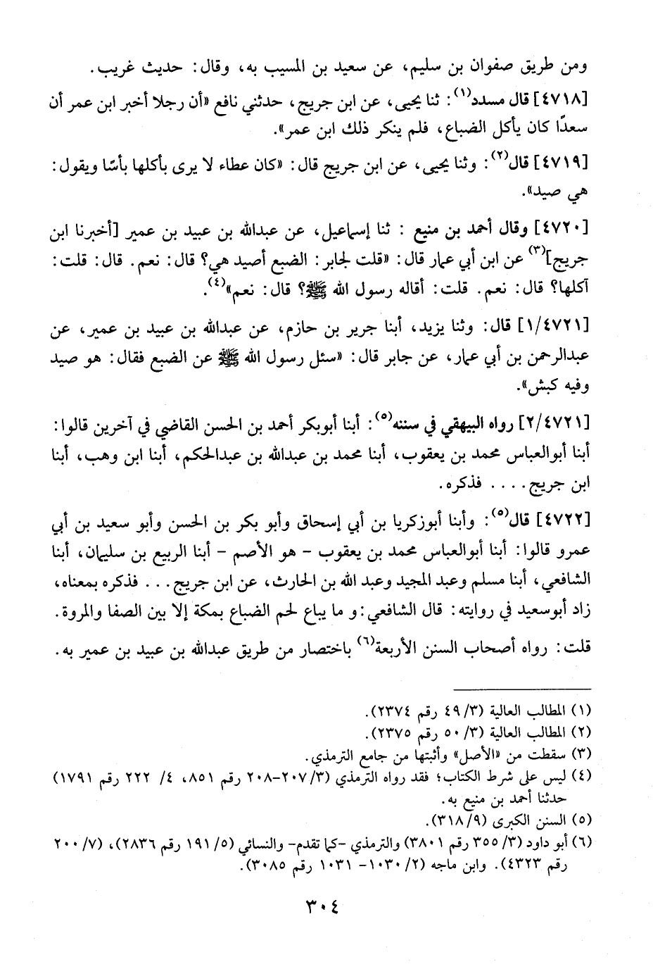 4722 - قال: وأبنا أبو زكريا بن أبي إسحاق وأبو بكر بن الحسن وأبو سعيد بن أبي عمرو قالوا: أبنا أَبُو الْعَبَّاسِ مُحَمَّدُ بْنُ يَعْقُوبَ- هُوَ الْأَصَمُّ- أبنا الربيع بن سليمان، أبنا الشافعي، أبنا مسلم وعبد المجيد وعبد اللَّهِ بْنُ الْحَارِثِ، عَنِ ابْنِ جُرَيْجٍ ... فَذَكَرَهُ بِمَعْنَاهِ، زَادَ أَبُو سَعِيدٍ فِي رِوَايَتِهِ: قَالَ الشافعي: وما يُبَاعُ لَحْمُ الضِّبَاعِ بِمَكَّةَ إِلَّا بَيْنَ الصَّفَا وَالْمَرْوَةِ. قُلْتُ: رَوَاهُ أَصْحَابُ السُّنَنِ الْأَرْبَعَةُ بِاخْتِصَارٍ مِنْ طَرِيقِ عَبْدِ اللَّهِ بْنِ عُبَيْدِ بْنِ عُمَيْرٍ به.