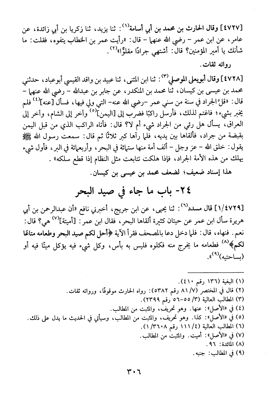 4729 / 1 - قَالَ مُسَدَّدٌ: ثنا يَحْيَى، عَنِ ابْنِ جُرَيْجٍ، أَخْبَرَنِي نَافِعٌ "أَنَّ عَبْدَ الرَّحْمَنِ بْنَ أَبِي هُرَيْرَةَ سَأَلَ ابْنَ عُمَرَ عَنْ حِيتَانٍ كَثِيرَةٍ ألقاها البحر، فقال ابن عمر: أميتة هِيَ؟ قَالَ: نَعَمْ. فَنَهَاهُ، قَالَ: فَلَمَّا دَخَلَ دَعَا بِالْمُصْحَفِ فَقَرَأَ الْآيَةَ {أُحِلَّ لَكُمْ صَيْدُ البحر وطعامه متاعًا لكم} فَطَعَامُهُ مَا يَخْرُجُ مِنْهُ فَكُلُوهُ فَلَيْسَ بِهِ بَأْسٌ، وَكُلُّ شَيْءٍ فِيهِ يُؤْكَلُ مَيِّتًا فِيهِ أو (بساحتيه) ".