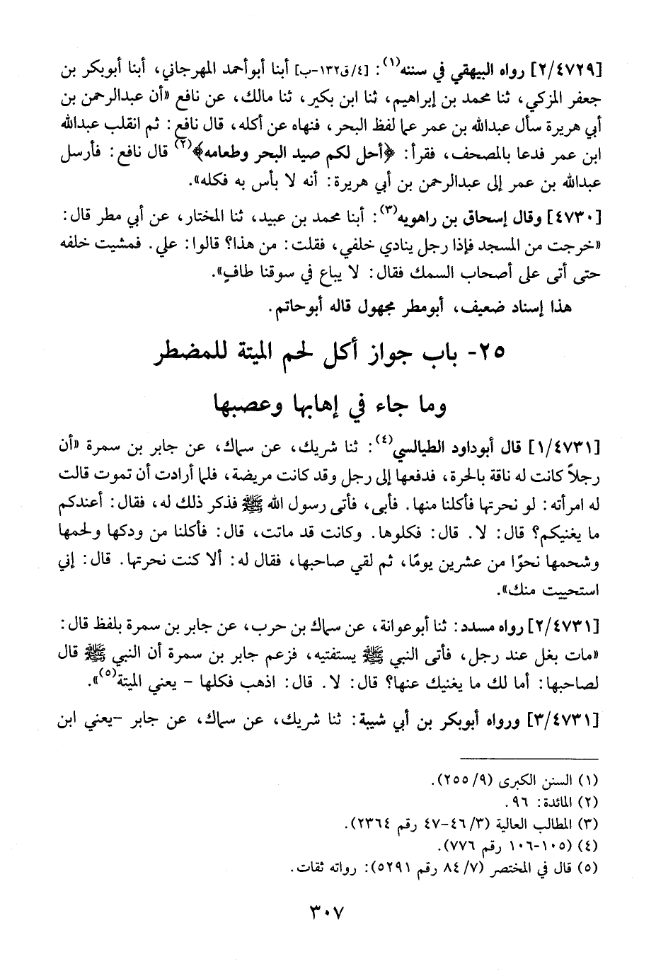 25- بَابُ جَوَازِ أَكْلِ لَحْمِ الْمَيْتَةِ لِلْمُضْطَرِ وَمَا جَاءَ فِي إِهَابِهَا وَعَصَبِهَا