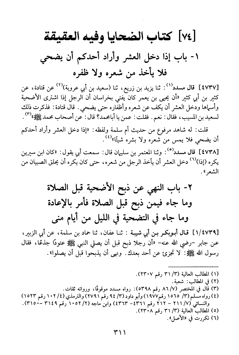 4737 - قَالَ مُسَدَّدٌ: ثَنَا يَزِيدُ بْنُ زُرَيْعٍ، ثَنَا (سَعِيدُ بْنُ أَبِي عَرُوبَةَ) عَنْ قَتَادَةَ، عَنِ كَثِيرِ بْنِ أَبِي كَثِيرٍ "أَنَّ يَحْيَي بْنَ يَعْمُرَ كَانَ يُفْتِي بِخُرَاسَانَ أَنَّ الرَّجُلَ إِذَا اشْتَرَى الْأُضْحِيَةَ وَأَسْمَاهَا وَدَخَلَ الْعَشْرُ أَنْ يَكُفَّ عَنْ شَعَرِهِ وَأَظْفَارِهِ حَتَّى يُضَحِّيَ. قَالَ قَتَادَةُ: فَذَكَرْتُ ذَلِكَ لِسَعِيدِ بْنِ الْمُسَيِّبِ، فَقَالَ: نَعَمْ. فَقُلْتُ: عَمَّنْ يَا أبا محمد؟ قال: عن أصحاب محمد سرو.