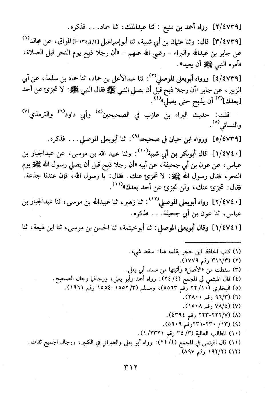 4739 / 4 - وَرَوَاهُ أَبُو يَعْلَى الْمَوْصِلِيُّ: ثَنَا عَبْدُ الْأَعْلَى بْنُ حَمَّادٍ، ثَنَا حَمَّادُ بْنُ سَلَمَةَ، عَنْ أَبِي الزُّبَيْرِ، عَنْ جَابِرٍ "أَنَّ رَجُلًا ذَبَحَ قَبْلَ أَنْ يُصَلِّيَ النَّبِيِّ - صَلَّى اللَّهُ عَلَيْهِ وَسَلَّمَ - فَقَالَ النَّبِيُّ - صَلَّى اللَّهُ عَلَيْهِ وَسَلَّمَ -: لَا تجزئ عَنْ أَحَدٍ بَعْدَكَ، أَنْ يَذْبَحَ حَتَّى يُصَلِّيَ ".