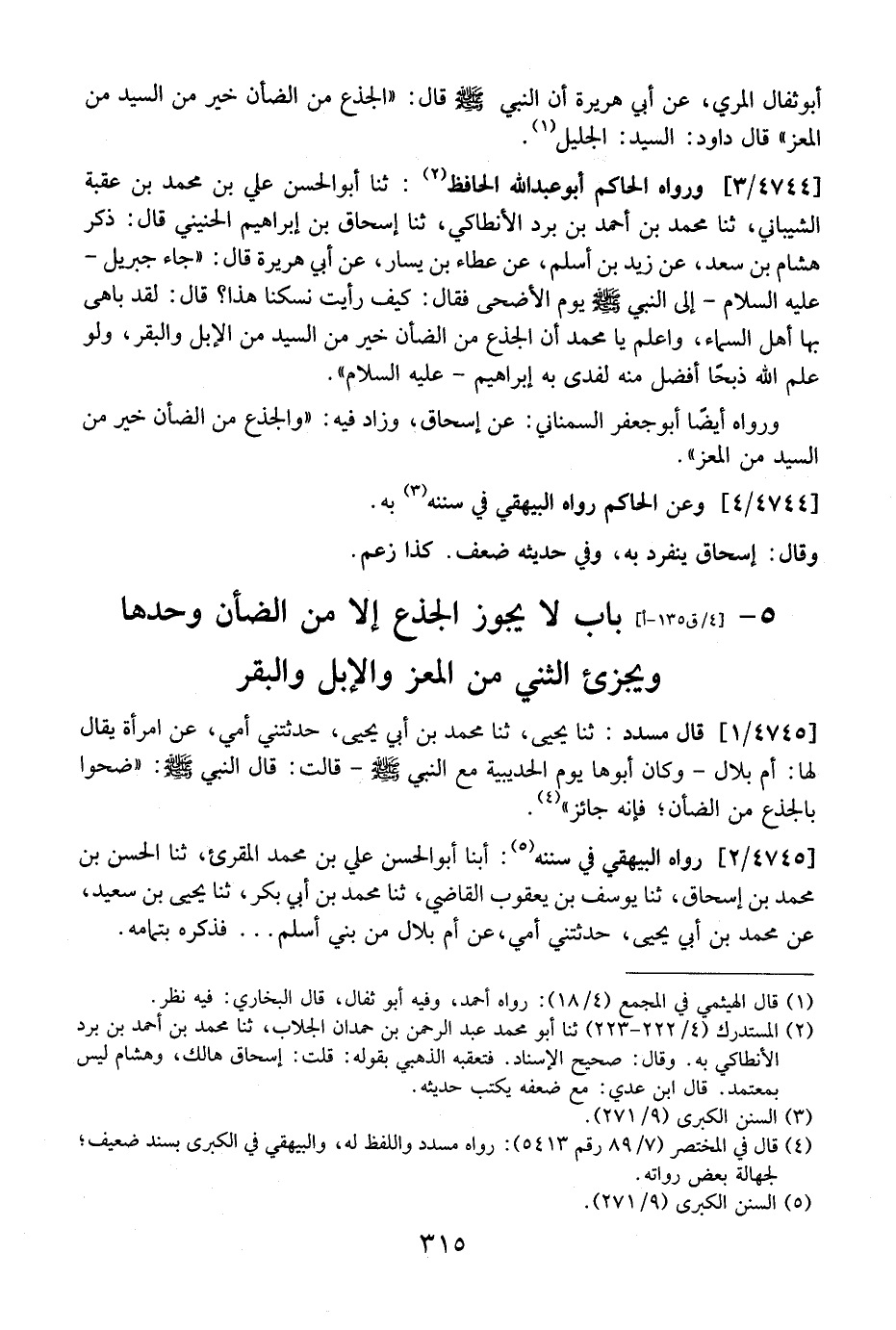 4744 / 3 - وَرَوَاهُ الْحَاكِمُ أَبُو عَبْدِ اللَّهِ الْحَافِظُ: ثَنَا أَبُو الْحَسَنِ عَلِيُّ بْنُ مُحَمَّدِ بْنِ عُقْبَةَ الشَّيْبَانِيُّ، ثَنَا مُحَمَّدُ بْنُ أَحْمَدَ بْنِ بُرْدٍ الْأَنْطَاكِيُّ، ثَنَا إِسْحَاقُ بْنُ إِبْرَاهِيمَ الْحُنَيْنِيُّ قَالَ: ذَكَرَ هِشَامُ بْنُ سَعْدٍ، عَنْ زَيْدِ بْنِ أَسْلَمَ، عَنْ عَطَاءِ بْنِ يَسَارٍ، عَنْ أَبِي هُرَيْرَةَ قَالَ: "جَاءَ جِبْرِيلُ- عَلَيْهِ السَّلَامُ- إِلَى النَّبِيِّ - صَلَّى اللَّهُ عَلَيْهِ وَسَلَّمَ - يَوْمَ الْأَضْحَى فَقَالَ: كَيْفَ رَأَيْتَ نُسُكَنَا هَذَا؟ قَالَ: لَقَدْ بَاهَى بِهَا أَهْلُ السَّمَاءِ، وَاعْلَمْ يَا مُحَمَّدُ أَنَّ الْجَذَعَ مِنَ الضَّأْنِ خَيْرٌ مِنَ السَّيِّدِ مِنَ الْإِبِلِ وَالْبَقَرِ، ولو علم الله ذبحًا أفضل منه لفدى بِهِ إِبْرَاهِيمُ- عَلَيْهِ السَّلَامُ ".