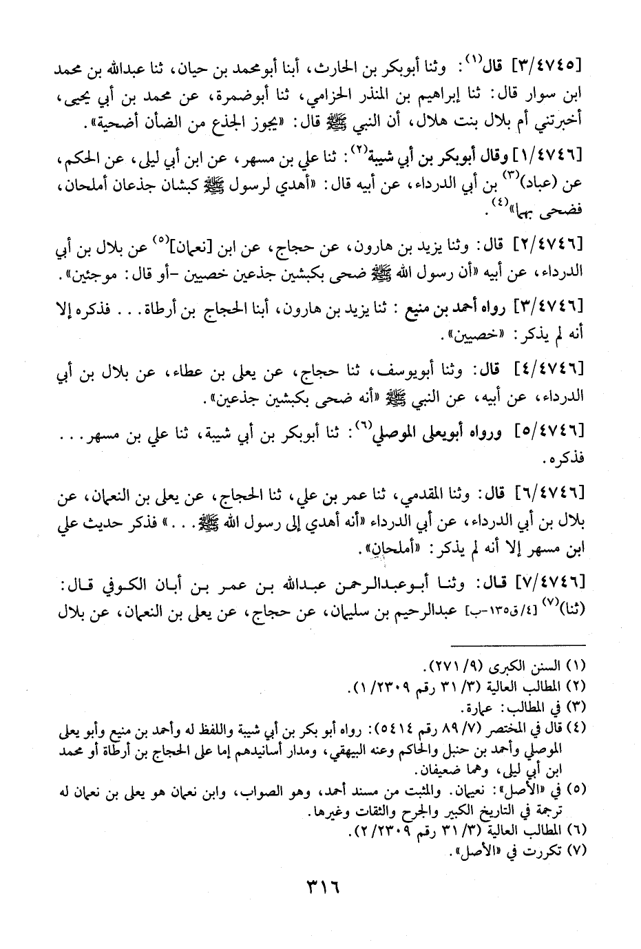 4746 / 6 - قال: وَثَنَا الْمُقَدَّمِيُّ، ثَنَا عُمَرُ بْنُ عَلِيٍّ، ثَنَا الْحَجَّاجُ، عَنْ يَعْلَى بْنِ النُّعْمَانِ، عَنْ بِلَالِ بْنِ أَبِي الدَّرْدَاءِ، عَنْ أَبِي الدَّرْدَاءِ "أَنَّهُ أَهْدَى إِلَى رَسُولِ اللَّهِ - صَلَّى اللَّهُ عَلَيْهِ وَسَلَّمَ - ... " فذكر حديث علي ابن مِسْهَرٍ إِلَّا أَنَّهُ لَمْ يَذْكُرْ: "أَمْلَحَانِ ".