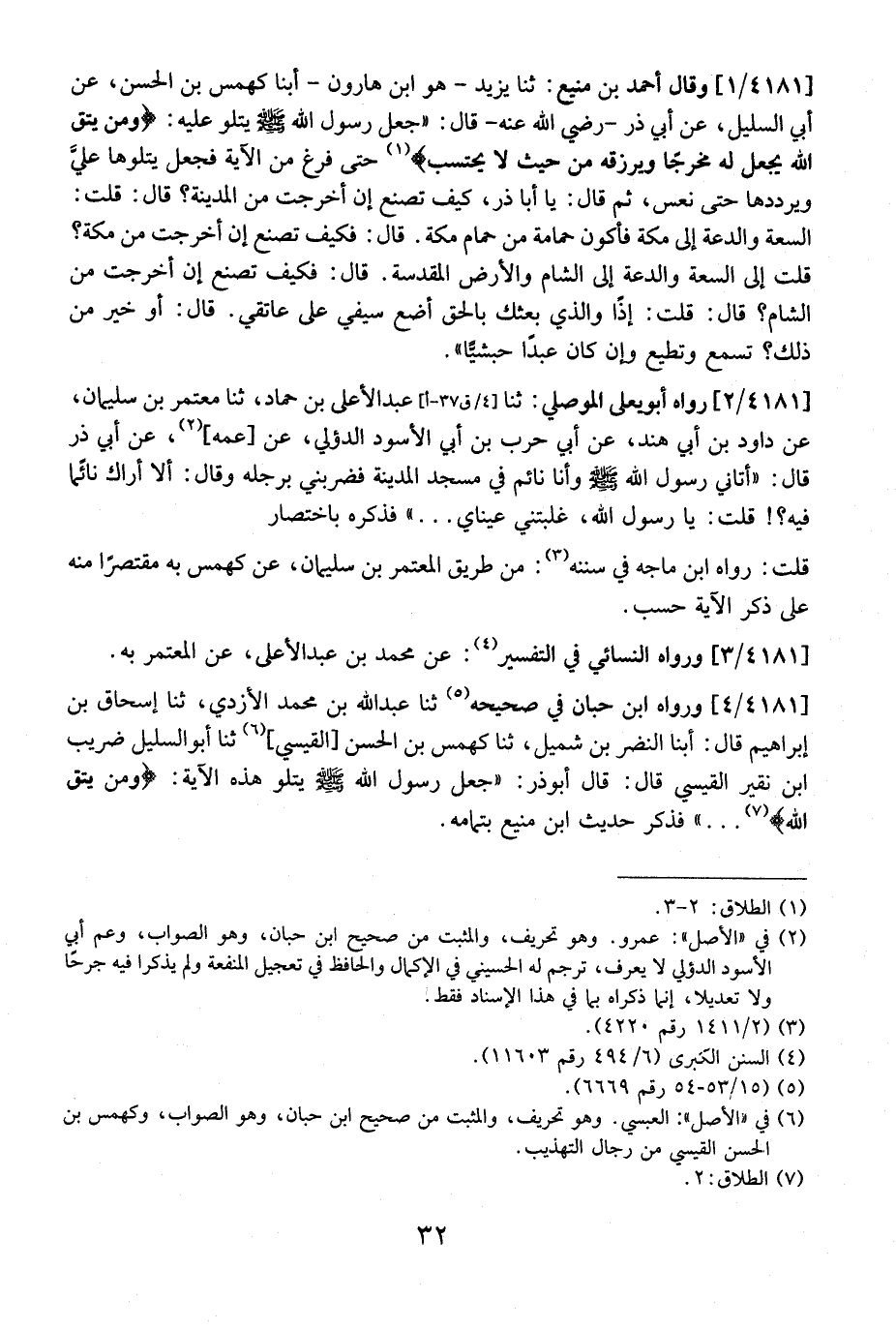 4181 / 4 - وَرَوَاهُ ابْنُ حِبَّانَ فِي صَحِيحِهِ ثَنَا عَبْدُ اللَّهِ بْنُ مُحَمَّدٍ الْأَزْدِيُّ، ثَنَا إِسْحَاقُ بْنُ إبراهيم قال: أبنا النَّضْرُ بْنُ شُمَيْلٍ، ثنا كَهْمَسُ بْنُ الْحَسَنِ القيسي ثنا أبو السليل ضريب ابن نقير القيسي قال: قَالَ أَبُو ذَرٍّ: "جَعَلَ رَسُولُ اللَّهِ - صَلَّى اللَّهُ عَلَيْهِ وَسَلَّمَ - يَتْلُو هَذِهِ الْآيَةَ: (وَمَنْ يتق الله.... " فَذَكَرَ حَدِيثَ ابْنِ مَنِيعٍ بِتَمَامِهِ.