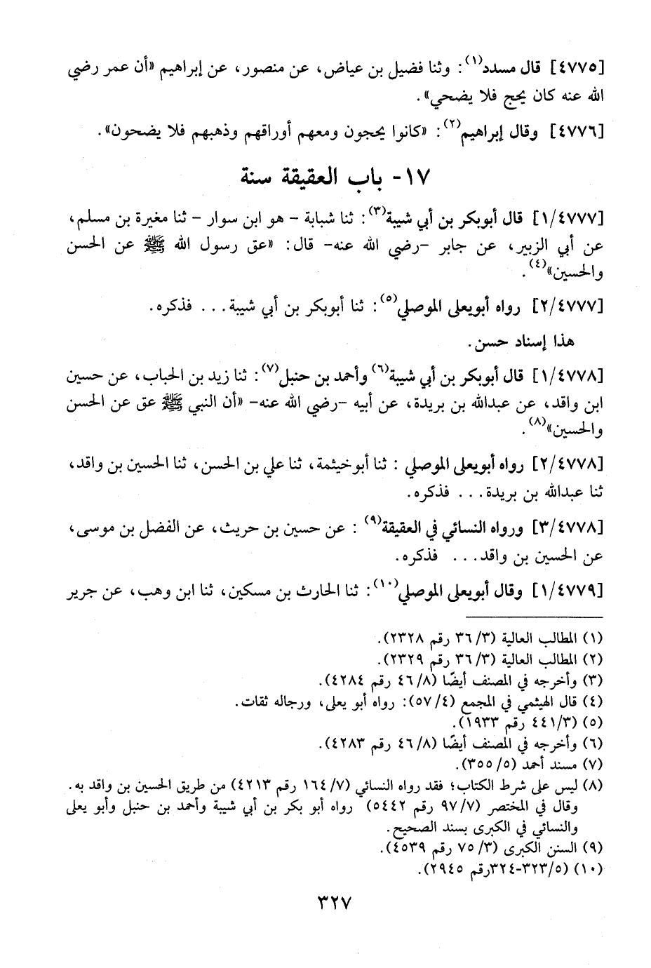 4778 / 1 - قَالَ أَبُو بَكْرِ بْنُ أَبِي شَيْبَةَ وَأَحْمَدُ بْنُ حنبل: ثنا زيد بن الحباب، عن حسين ابن وَاقِدٍ، عَنْ عَبْدِ اللَّهِ بْنِ بُرَيْدَةَ، عَنْ أَبِيهِ- رَضِيَ اللَّهُ عَنْهُ- "أَنّ النَّبِيَّ - صَلَّى اللَّهُ عَلَيْهِ وَسَلَّمَ - عَقَّ عَنِ الْحَسَنِ وَالْحُسَيْنِ ".