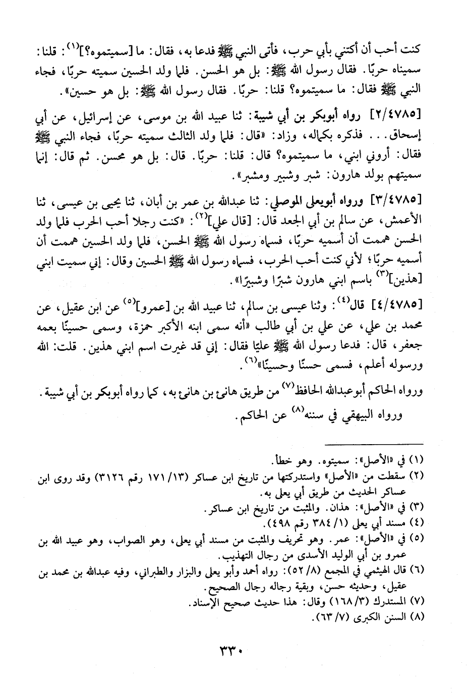 4785 / 2 - رَوَاهُ أَبُو بَكْرِ بْنُ أَبِي شَيْبَةَ: ثنا عُبَيْدُ اللَّهِ بْنُ مُوسَى، عَنْ إِسْرَائِيلَ، عَنْ أَبِي إسحاق ... فذكره بكماله، وَزَادَ: "قَالَ: فَلَمَّا وُلِدَ الثَّالِثُ سميته حربا، فَجَاءَ النَّبِيُّ - صَلَّى اللَّهُ عَلَيْهِ وَسَلَّمَ - فَقَالَ: أروني ابني، ما سميتموه؟ قال: قلنا: حربا. قال: بَلْ هُوَ مُحْسِنٌ. ثُمَّ قَالَ: إِنَّمَا سَمَّيْتُهُمْ بِوَلَدِ هَارُونَ: شَبْرٌ وَشُبَيْرٌ وَمُشْبِرٌ".