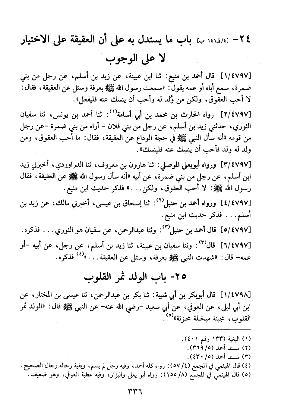 4797 / 1 - قَالَ أَحْمَدُ بْنُ مَنِيعٍ: ثَنَا ابْنُ عُيَيْنَةَ، عَنْ زَيْدِ بْنِ أَسْلَمَ، عَنْ رَجُلٍ مِنْ بَنِي ضَمْرَةَ، سَمِعَ أَبَاهُ أَوْ عَمَّهُ يَقُولُ: "سَمِعْتُ رَسُولَ اللَّهِ - صَلَّى اللَّهُ عَلَيْهِ وَسَلَّمَ - بِعَرَفَةَ وَسُئِلَ عَنِ الْعَقِيقَةِ، فَقَالَ: لَا أُحِبُّ الْعُقُوقَ، وَلَكِنْ مَنْ وُلد لَهُ وَأَحَبَّ أَنْ يَنْسُكَ عَنْهُ فَلْيَفْعَلْ ".