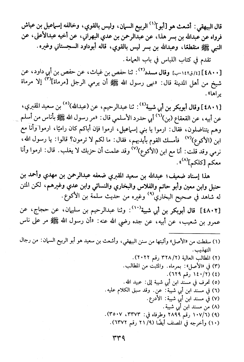 4801 - وَقَالَ أَبُو بَكْرِ بْنُ أَبِي شَيْبَةَ: ثَنَا عَبْدُ الرَّحِيمِ، عَنْ (عَبْدُ اللَّهِ) بْنُ سَعِيدٍ الْمَقْبُرِيُّ، عَنْ أَبِيهِ، عَنِ الْقَعْقَاعِ (بْنِ) أَبِي حَدْرَدٍ الْأَسْلَمِيُّ قَالَ: "مَرَّ رَسُولُ اللَّهِ - صَلَّى اللَّهُ عَلَيْهِ وَسَلَّمَ - بِأُنَاسٍ مِنْ أَسْلَمَ وَهُمْ يَتَنَاضَلُونَ، فَقَالَ: ارْمُوا يَا بَنِي إِسْمَاعِيلَ، ارْمُوا فَإِنَّ أَبَاكُمْ كَانَ رَامِيًا، ارْمُوا وَأَنَا مَعَ ابْنِ (الْأَكْوَعِ) فَأَمْسَكَ الْقَوْمُ بِأَيْدِيهِمْ، فَقَالَ: ما لكم لَا تَرْمُونَ؟ قَالُوا: يَا رَسُولَ اللَّهِ، نَرْمِي وَقَدْ قُلْتُ: أَنَا مَعَ ابْنِ (الْأَكْوَعِ) وَقَدْ عَلِمْتَ أَنَّ حِزْبَكَ لَا يُغْلَبُ. قَالَ: ارْمُوا وَأَنَا مَعَكُمْ كُلُّكُمْ".