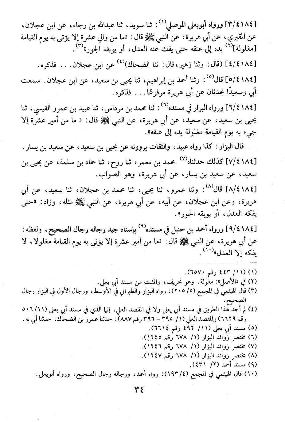 4184 / 3 - وَرَوَاهُ أَبُو يَعْلَى الْمَوْصِلِيُّ: ثنا سُوَيْدٌ، ثنا عَبْدُ اللَّهِ بْنُ رَجَاءٍ، عَنِ ابْنِ عَجْلَانَ، عَنِ الْمَقْبُرِيِّ، عَنْ أَبِي هُرَيْرَةَ، عَنِ النَّبِيِّ - صَلَّى اللَّهُ عَلَيْهِ وَسَلَّمَ - قَالَ: "مَا مِنْ وَالِي عَشَرَةٍ إِلَّا يُؤْتَى بِهِ يَوْمَ الْقِيَامَةِ أمغلولة، يَدُهُ إِلَى عُنُقِهِ حَتَّى يَفُكَّ عَنْهُ الْعَدْلُ، أَوْ يُوبِقَهُ الْجَوْرُ.