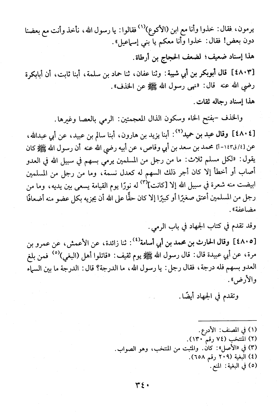 4805 - وَقَالَ الْحَارِثُ بْنُ مُحَمَّدِ بْنِ أَبِي أُسَامَةَ: ثنا زَائِدَةُ، عَنِ الْأَعْمَشِ، عَنْ عْمَرِو بْنِ مُرَّةَ، عَنْ أَبِي عُبَيْدَةَ قَالَ: قَالَ رَسُولُ اللَّهِ - صَلَّى اللَّهُ عَلَيْهِ وَسَلَّمَ - يَوْمَ ثَقِيفٍ: "قَاتِلُوا أَهْلَ (الْبَغْيِ) فَمَنْ بَلَغَ الْعَدُوَّ بِسَهْمٍ فَلَهُ درَجَةٌ، فَقَالَ رَجُلٌ: يَا رَسُولَ اللَّهِ، مَا الدَّرَجَةُ؟ قَالَ: الدَّرَجَةُ مَا بَيْنَ السَّمَاءِ والأرض". وتقدم في الجهاد أيضًا.