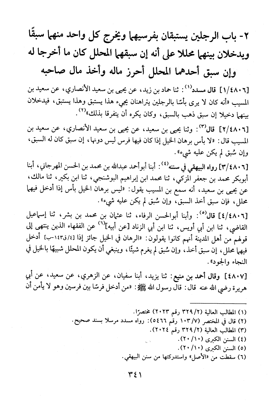 4806 / 3 - رَوَاهُ الْبَيْهَقِيُّ في سننه: أبنا أبو أحمد عبد الله بن محمد بن الحسن المهرجاني، أبنا أَبُو بَكْرٍ مُحَمَّدُ بْنُ جَعْفَرٍ الْمُزَكِّي، ثَنَا محمد ابن إِبْرَاهِيمَ الْبُوشَنْجِيُّ، ثَنَا ابْنُ بُكَيْرٍ، ثَنَا مَالِكٌ، عن يحيى بن سعيد، أنه سمع بن الْمُسَيِّبِ يَقُولُ: "لَيْسَ بِرَهَانِ الْخَيْلِ بَأْسٌ إِذَا أُدْخِلَ فِيهِمَا مُحَلِّلٌ، فَإِنْ سَبَقَ أَخَذَ السَّبْقَ، وَإِنْ سُبِقَ لَمْ يَكُنْ عَلَيْهِ شَيْءٌ".