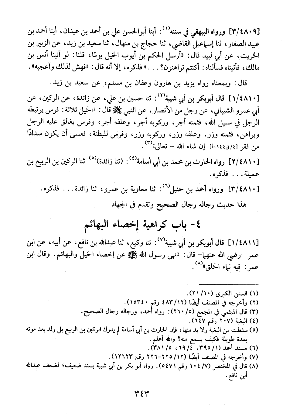4809 / 3 - ورواه البيهقي في سننه: أبنا أَبُو الْحَسَنِ عَلِيُّ بْنُ أَحْمَدَ بْنِ عَبْدَانَ، أبنا أَحْمَدُ بْنُ عُبَيْدٍ الصَّفَّارُ، ثَنَا إِسْمَاعِيلُ الْقَاضِي، ثَنَا حَجَّاجُ بْنُ مِنْهَالٍ، ثَنَا سَعِيدُ بْنُ زَيْدٍ، عَنِ الزُّبَيْرِ بْنِ الْخِرِّيتِ، عَنْ أَبِي لَبِيدٍ قَالَ: "أَرْسَلَ الْحَكَمُ بْنُ أَيُّوبَ الْخَيْلَ يَوْمًا، قُلْنَا: لَوْ أَتَيْنَا أَنَسَ بْنَ مَالِكٍ، فَأَتَيْنَاهُ فَسَأَلْنَاهُ: أَكُنْتُمْ تُرَاهِنُونَ؟ ... " فَذَكَرَهُ،! إِلَّا أَنَّهُ قَالَ: "فَهَشَّ لِذَلِكَ وَأَعْجَبَهُ". قَالَ: وَبِمَعْنَاهُ رَوَاهُ يَزِيدُ بْنُ هَارُونَ وَعَفَّانُ بْنُ مُسْلِمٍ، عَنْ سَعِيدِ بْنِ زَيْدٍ.