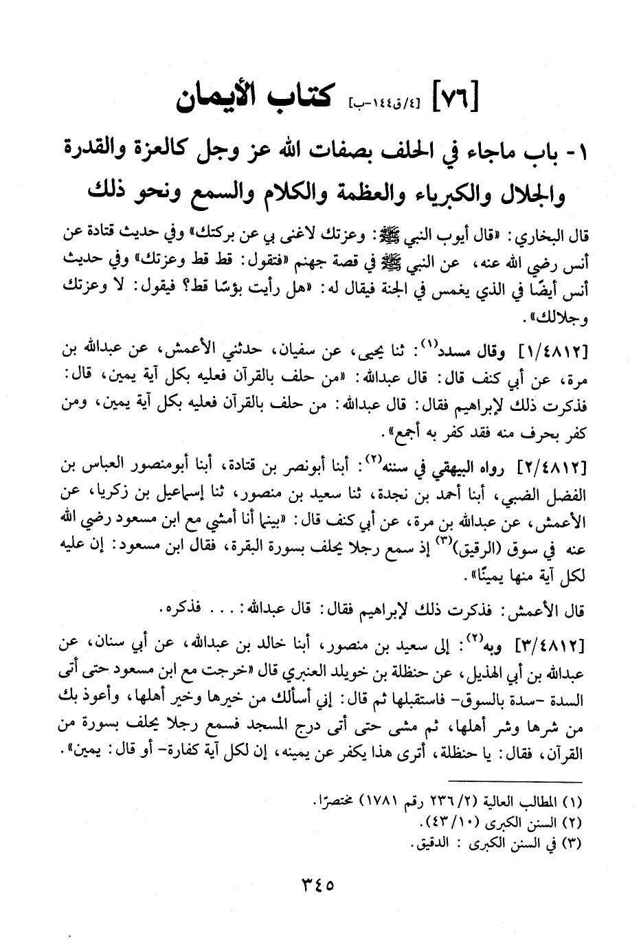 4812 / 2 - رَوَاهُ الْبَيْهَقِيُّ فِي سننه: أبنا أبو نصر بن قتادة، أبنا أبو منصور العباس بن الفضل الضبي، أبنا أَحْمَدُ بْنُ نَجْدَةَ، ثَنَا سَعِيدُ بْنُ مَنْصُورٍ، ثَنَا إِسْمَاعِيلُ بْنُ زَكَرِيَّا، عَنِ الْأَعْمَشِ، عَنْ عَبْدِ اللَّهِ بْنِ مُرَّةَ، عَنْ أبي كنف قَالَ: "بَيْنَمَا أَنَا أَمْشِي مَعَ ابْنِ مَسْعُودٍ رَضِيَ اللَّهُ عَنْهُ فِي سُوقِ (الرَّقِيقِ) إِذْ سَمِعَ رَجُلًا يَحْلِفُ بِسُورَةِ الْبَقَرَةِ، فَقَالَ ابْنُ مسعود: إن عليه لكل آيَةٍ مِنْهَا يَمِينًا".
