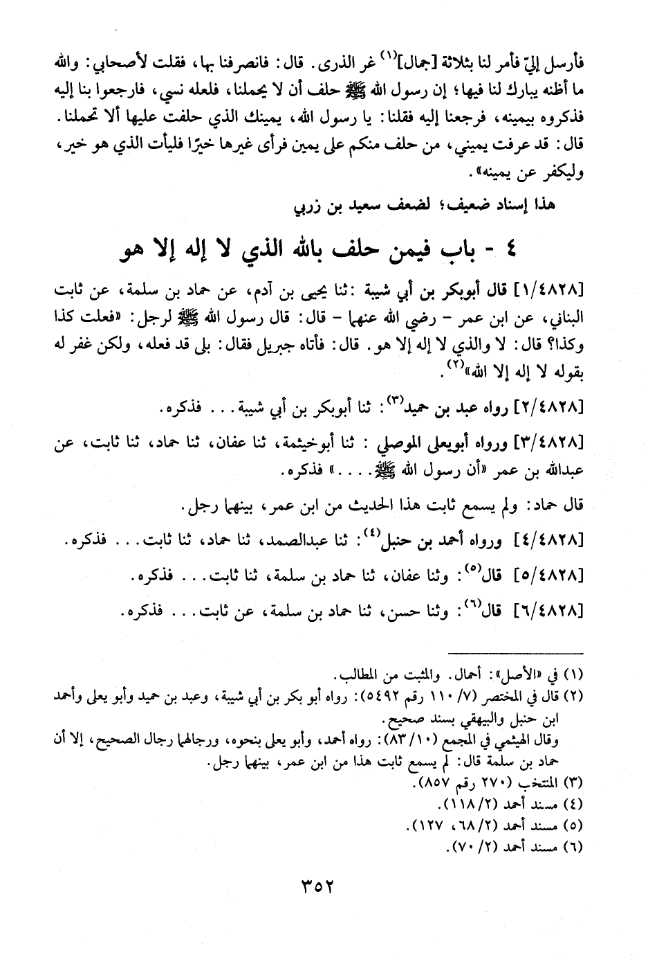 4828 / 1 - قَالَ أَبُو بَكْرِ بْنُ أَبِي شَيْبَةَ: ثَنَا يَحْيَى بْنُ آدَمَ، عَنْ حَمَّادِ بْنِ سَلَمَةَ، عَنْ ثَابِتٍ الْبُنَانِيِّ، عَنِ ابْنِ عُمَرَ- رَضِيَ اللَّهُ عَنْهُمَا- قَالَ: قَالَ رَسُولُ اللَّهِ - صَلَّى اللَّهُ عَلَيْهِ وَسَلَّمَ - لِرَجُلٍ: "فَعَلْتَ كَذَا وَكَذَا؟ قَالَ: لَا وَالَّذِي لَا إِلَهَ إِلَّا هُوَ. قَالَ: فَأَتَاهُ جِبْرِيلُ فَقَالَ: بَلَى قَدْ فَعَلَهُ، وَلَكِنْ غُفِرَ لَهُ بِقَوْلِهِ لَا إِلَهَ إِلَّا اللَّهُ ".