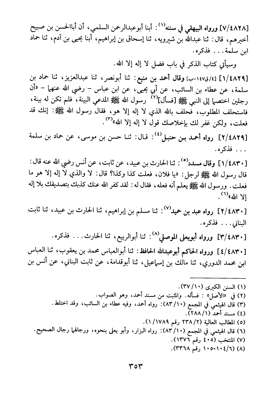 4829 / 1 - وَقَالَ أَحْمَدُ بْنُ مَنِيعٍ: ثَنَا أَبُو نَصْرٍ، ثَنَا عَبْدِ الْعَزِيزِ، ثَنَا حَمَّادُ بْنُ سَلَمَةَ، عَنْ عَطَاءِ بْنِ السائب، عن أَبِي يَحْيَى، عَنِ ابْنِ عَبَّاسٍ- رَضِيَ اللَّهُ عَنْهُمَا- "أَنَّ رَجُلَيْنِ اخْتَصَمَا إِلَى النَّبِيِّ - صَلَّى اللَّهُ عَلَيْهِ وَسَلَّمَ - فَسَأَلَ رَسُولُ اللَّهِ - صَلَّى اللَّهُ عَلَيْهِ وَسَلَّمَ - الْمُدَّعِيَ الْبَيِّنَةَ، فَلَمْ تَكُنْ لَهُ بَيِّنَةٌ، فَاسْتَحْلَفَ الْمَطْلُوبَ، فَحَلَفَ بِاللَّهِ الَّذِي لَا إِلَهَ إِلَّا هُوَ، فَقَالَ رَسُولُ اللَّهِ - صَلَّى اللَّهُ عَلَيْهِ وَسَلَّمَ -: إِنَّكَ قَدْ فَعَلْتَ، وَلَكِنْ غُفِرَ لَكَ بِإِخْلَاصِكَ قَوْلَ لَا إِلَهَ إِلَّا اللَّهُ ".