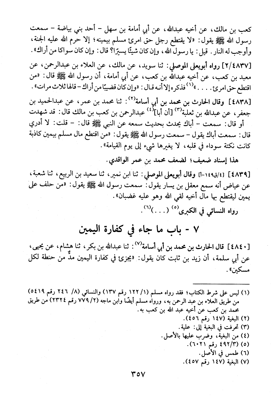 4838 - وَقَالَ الْحَارِثُ بْنُ مُحَمَّدِ بْنِ أَبِي أُسَامَةَ: ثَنَا مُحَمَّدُ بْنُ عُمَرَ، عَنْ عَبْدِ الْحَمِيدِ بْنِ جَعْفَرٍ، عَنْ عَبْدِ اللَّهِ بن ثعلبة أن أباعبد الرَّحْمَنِ بْنَ كَعْبِ بْنِ مَالِكٍ قَالَ: قَدْ شَهِدْتُ أَوْ قَالَ: سَمِعْتُ- أَبَاكَ يُحَدِّثُ بِحَدِيثٍ سمعه عَنِ النَّبِيِّ - صَلَّى اللَّهُ عَلَيْهِ وَسَلَّمَ - قَالَ: - قلت: لا أدري قال: سمعت أباك يَقُولُ- سَمِعْتُ رَسُولَ اللَّهِ - صَلَّى اللَّهُ عَلَيْهِ وسلم - يقول: "من اقتطع مالك مُسْلِمٍ بِيَمِينٍ كَاذِبَةٍ كَانَتْ نُكْتَةً سَوْدَاءَ فِي قَلْبِهِ، لَا يُغِيِّرُهَا شَيْءٌ إِلَى يَوْمِ الْقِيَامَةِ".
