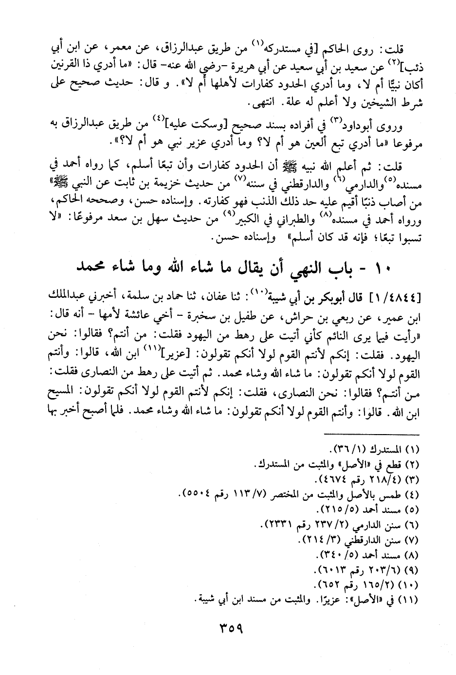 4844 / 1 - قَالَ أَبُو بَكْرِ بْنُ أَبِي شَيْبَةَ: ثَنَا عَفَّانُ، ثَنَا حَمَّادُ بْنُ سَلَمَةَ، أَخْبَرَنِي عَبْدُ الملك ابن عمير، عن ربعي بْنَ حِرَاشٍ، عَنْ طُفَيْلِ بْنِ سَخْبَرَةَ- أَخِي عَائِشَةَ لِأُمِّهَا- أَنَّهُ قَالَ: "رَأَيْتُ فِيمَا يَرَى النَّائِمُ كَأَنِّي أَتَيْتُ عَلَى رَهْطٍ مِنَ الْيَهُودِ فَقُلْتُ: مَنْ أَنْتُمْ؟ فَقَالُوا: نَحْنُ الْيَهُودُ. فَقُلْتُ: إِنَّكُمْ لَأَنْتُمُ الْقَوْمُ لَوْلَا أَنَّكُمْ تَقُولُونَ: عُزَيْرٌ ابن الله، قالوا: وأنتم القوم لولا أنكم تَقُولُونَ: مَا شَاءَ اللَّهُ وَشَاءَ مُحَمَّدٌ. ثُمَّ أَتَيْتُ عَلَى رَهْطٍ مِنَ النَّصَارَى فَقُلْتُ: مَنْ أَنْتُمْ؟ فَقَالُوا: نَحْنُ النَّصَارَى، فَقُلْتُ: إِنَّكُمْ لَأَنْتُمُ الْقَوْمُ لَوْلَا أَنَّكُمْ تَقُولُونَ: الْمَسِيحُ ابْنُ اللَّهِ. قالوا: وأنتم القوم لولا أنكم تقولون: ما شَاءَ اللَّهُ وَشَاءَ مُحَمَّدٌ. فَلَمَّا أَصْبَحَ أَخْبَرَ بها