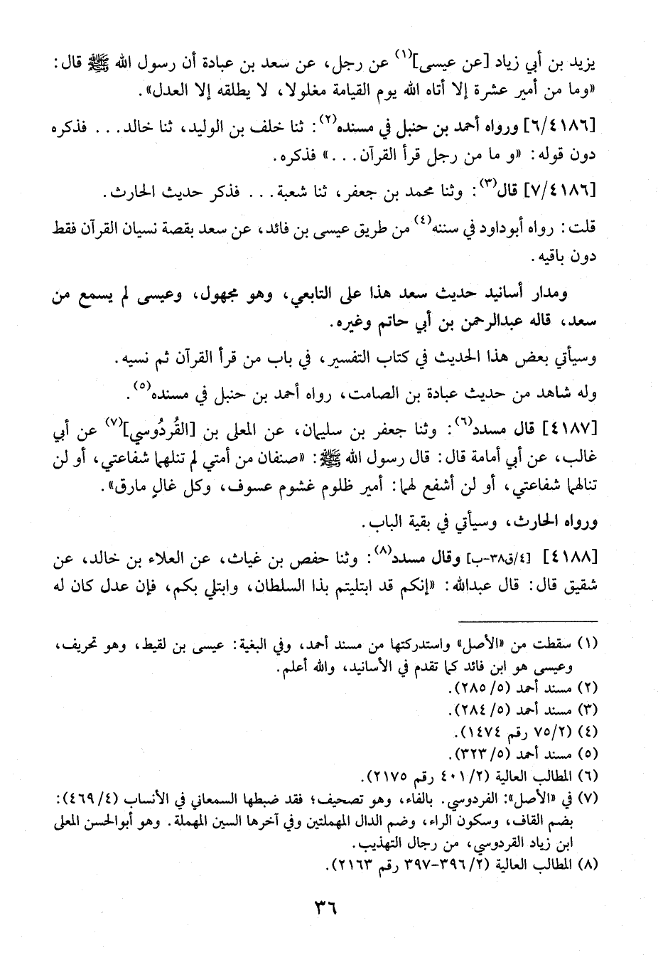 4187 - قَالَ مُسَدَّدٌ: وَثنا جَعْفَرُ بْنُ سُلَيْمَانَ، عَنِ الْمُعَلَّى بْنِ القُردُوسي، عَنْ أَبِي غَالِبٍ، عَنْ أَبِي أُمَامَةَ قَالَ: قَالَ رَسُولُ اللَّهِ - صلى الله عليه وسلم -: (صِنْفَانِ مِنْ أُمَّتِي لَمْ تَنَلْهُمَا شَفَاعَتِي، أَوْ لن تنالهما شفاعتي، أو لن أَشْفَعَ لَهُمَا: أَمِيرٌ ظَلُومٌ غَشُومٌ عَسُوفٌ، وَكُلُّ غالٍ مَارِقٌ".