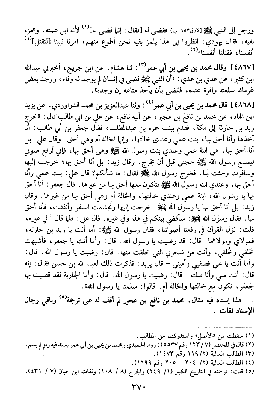 4868 - قَالَ مُحَمَّدُ بْنُ يَحْيَى بْنِ أَبِي عُمَرَ: وَثَنَا عَبْدُ الْعَزِيزِ بْنُ مُحَمَّدٍ الدَّرَاوَرْدِيُّ، عَنْ يَزِيدَ ابن الْهَادِ، عَنْ مُحَمَّدِ بْنِ نَافِعِ بْنِ عُجَيْرٍ، عَنْ أَبِيهِ نَافِعٍ، عَنْ عَلِيِّ بْنِ أَبِي طَالِبٍ قَالَ: "خَرَجَ زَيْدُ بْنُ حَارِثَةَ إِلَى مَكَّةَ، فَقَدِمَ بِبِنْتِ حَمْزَةَ بْنِ عَبْدِ الْمُطَّلِبِ، فَقَالَ جَعْفَرُ بْنُ أَبِي طَالِبٍ: أَنَا آخُذُهَا وَأَنَا أَحَقُّ بِهَا، بِنْتُ عَمِّي وَعِنْدِي خَالَتُهَا، وَإِنَّمَا الْخَالَةُ أُمٌّ وَهِيَ أَحَقُّ. وَقَالَ عَلِيٌّ: بَلْ أَنَا أَحَقُّ بِهَا، هِيَ ابْنَةُ عَمِّي وعندي بِنْتِ رَسُولِ اللَّهِ - صَلَّى اللَّهُ عَلَيْهِ وَسَلَّمَ - وَهِيَ أَحَقُّ بِهَا، فَإِنِّي أَرْفَعُ صَوْتِي لِيَسْمَعَ رَسُولُ اللَّهِ - صَلَّى اللَّهُ عَلَيْهِ وَسَلَّمَ - حُجَّتِي قبل أن يخرج. وقال زيد: بل أَنَا أَحَقُّ بِهَا؟ خَرَجْتُ إِلَيْهَا وَسَافَرْتُ وَجِئْتُ بِهَا. فَخَرَجَ رَسُولُ اللَّهِ - صَلَّى اللَّهُ عَلَيْهِ وَسَلَّمَ - فَقَالَ: مَا شَأْنُكُمْ؟ قَالَ عَلِيٌّ: بِنْتُ عَمِّي وَأَنَا أَحَقُّ بِهَا، وَعِنْدِي ابْنَةُ رَسُولِ اللَّهِ - صَلَّى اللَّهُ عَلَيْهِ وَسَلَّمَ - فَتَكُونُ مَعَهَا أَحَقُّ بِهَا مِنْ غَيْرِهَا. قَالَ جَعْفَرٌ: أَنَا أَحَقُّ بِهَا يَا رَسُولَ اللَّهِ، ابْنَةُ عَمِّي وعندي خالتها، والخالة أم وفي أَحَقُّ بِهَا مِنْ غَيْرِهَا. وَقَالَ زيد: بَلْ أنا أحق بها يا رسول الله خَرَجْتُ إِلَيْهَا وَتَجَشَّمْتُ السَّفَرَ وَأَنْفَقْتُ، فَأَنَا أَحَقُّ بِهَا. فَقَالَ رَسُولُ اللَّهِ - صَلَّى اللَّهُ عَلَيْهِ وَسَلَّمَ -: سَأَقْضِي بَيْنَكُمْ فِي هَذَا وَفِي غَيْرِهِ. قَالَ عَلِيٌّ: فَلَمَّا قَالَ: فِي غَيْرِهِ، قُلْتُ: نَزَلَ الْقُرْآنُ فِي رَفْعِنَا أَصْوَاتَنَا، فَقَالَ رَسُولُ اللَّهِ - صَلَّى اللَّهُ عَلَيْهِ وَسَلَّمَ -: أَمَّا أَنْتَ يَا زَيْدُ بْنَ حَارِثَةَ، فَمَوْلَايَ وَمَوْلَاهُمَا. قَالَ: قَدْ رَضِيتُ يَا رَسُولَ اللَّهِ. قَالَ: وَأَمَّا أنت يا جعفر، فأشبهت خَلقي وخُلقي، وأنخما مِنْ شَجَرَتِي الَّتِي خُلِقْتُ مِنْهَا. قَالَ: رَضِيتُ يَا رَسُولَ اللَّهِ. قَالَ: وَأَمَّا أَنْتَ يَا عَلِيُّ فَصَفِيِّي وَأَمِينِي- قَالَ يَزِيدُ: فَذَكَرْتُ ذَلِكَ لِعَبْدِ اللَّهِ بْنِ حَسَنٍ فَقَالَ: إِنَّهُ قَالَ: أَنْتَ مِنِّي وَأَنَا مِنْكَ- قَالَ: رَضِيتُ يَا رَسُولَ اللَّهِ. قَالَ: وَأَمَّا الْجَارِيَةُ فَقَدْ قَضَيْتُ بِهَا لِجَعْفَرٍ، تَكُونُ مَعَ خَالَتِهَا وَالْخَالَةُ أُمٌّ. قَالُوا: سَلَّمْنَا يَا رَسُولَ اللَّهِ ".