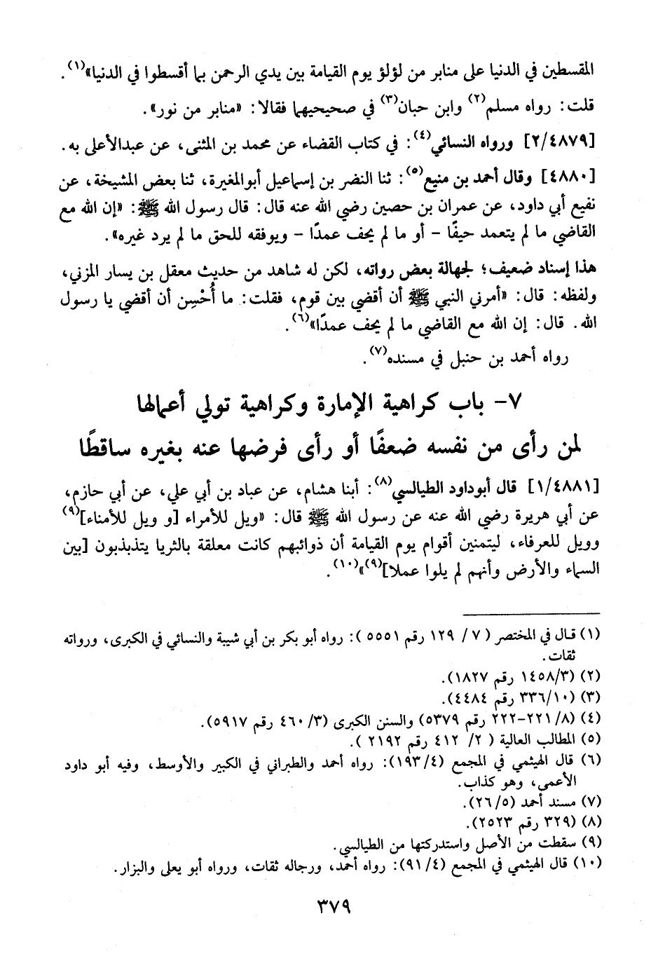 الْمُقْسِطِينَ فِي الدُّنْيَا عَلَى مَنَابِرٍ مِنْ لُؤْلُؤٍ يَوْمَ الْقِيَامَةِ بَيْنَ يَدِيِ الرَّحْمَنِ بِمَا أَقْسَطُوا فِي الدُّنْيَا". قُلْتُ: رَوَاهُ مُسْلِمٌ وَابْنُ حِبَّانَ في صحيحيهما فقالا: "مَنَابِرَ مِنْ نُورٍ".