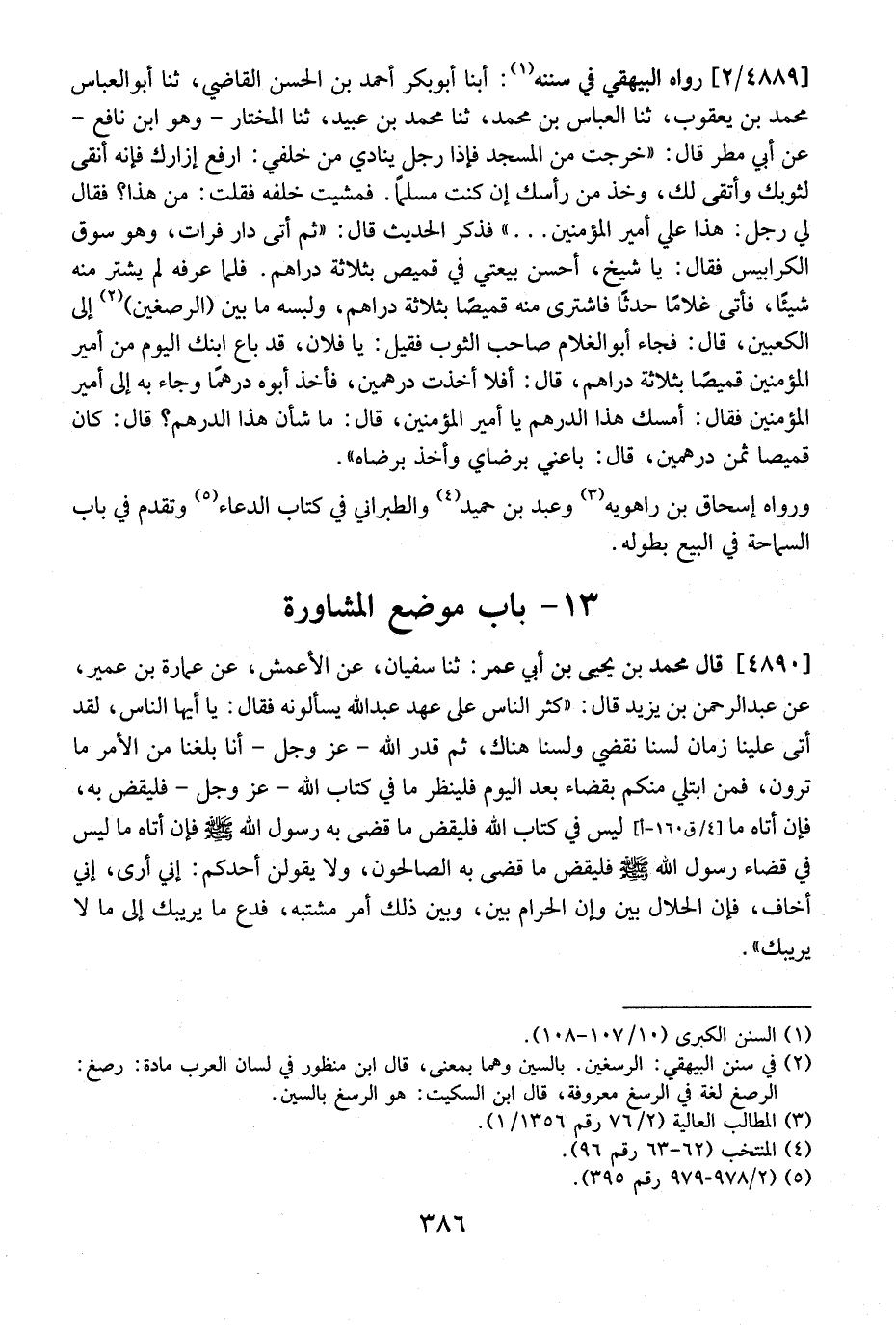 4889 / 2 - رواه البيهقي في سننه: أبنا أَبُو بَكْرٍ أَحْمَدُ بْنُ الْحَسَنِ الْقَاضِي، ثَنَا أَبُو الْعَبَّاسِ مُحَمَّدُ بْنُ يَعْقُوبَ، ثَنَا الْعَبَّاسُ بْنُ مُحَمَّدٍ، ثَنَا مُحَمَّدُ بْنُ عُبَيْدٍ، ثَنَا المختار- وهو ابن نَافِعٍ- عَنْ أَبِي مَطَرٍ قَالَ: "خَرَجْتُ مِنَ الْمَسْجِدِ فَإِذَا رَجُلٌ يُنَادِي مِنْ خَلْفِي: ارْفَعْ إِزَارَكَ فإنه أنقى لِثَوْبِكَ وَأَتْقَى لَكَ، وَخُذْ مِنْ رَأْسِكَ إِنْ كُنْتَ مُسْلِمًا. فَمَشَيْتُ خَلْفَهُ فَقُلْتُ: مَنْ هَذَا؟ فقال لِي رَجُلٌ: هَذَا عَلِيٌّ أَمِيرُ الْمُؤْمِنِينَ ... " فَذَكَرَ الْحَدِيثَ قَالَ: "ثُمَّ أَتَى دَارَ فُرَاتٍ، وَهُوَ سُوقُ الْكَرَابِيسِ فَقَالَ: يَا شَيْخُ، أَحْسِنْ بَيْعَتِي فِي قَمِيصٍ بِثَلَاثَةِ دَرَاهِمَ. فَلَمَّا عَرَفَهُ لَمْ يَشْتَرِ مِنْهُ شَيْئًا، فَأَتَى غُلَامًا حَدَثًا فَاشْتَرَى مِنْهُ قَمِيصًا بِثَلَاثَةِ دَرَاهِمَ، وَلَبِسَهُ مَا بَيْنَ (الرُّصْغَيْنِ) إِلَى الْكَعْبَيْنِ، قَالَ: فَجَاءَ أَبُو الْغُلَامِ صاحب الثوب فقيل: يَا فُلَانُ، قَدْ بَاعَ ابْنُكَ الْيَوْمَ مِنْ أَمِيرِ الْمُؤْمِنِينَ قَمِيصًا بِثَلَاثَةِ دَرَاهِمَ، قَالَ: أَفَلَا أخذت درهمين، فأخذ أبو دِرْهَمًا وَجَاءَ بِهِ إِلَى أَمِيرِ الْمُؤْمِنِينَ فَقَالَ: أَمْسِكْ هَذَا الدِّرْهَمَ يَا أَمِيرَ الْمُؤْمِنِينَ، قَالَ: مَا شَأْنُ هَذَا الدِّرْهَمِ؟ قَالَ: كَانَ قَمِيصًا ثَمَنَ دِرْهَمَيْنِ، قَالَ: بَاعَنِي بِرِضَايَ وَأَخَذَ بِرِضَاهُ ".