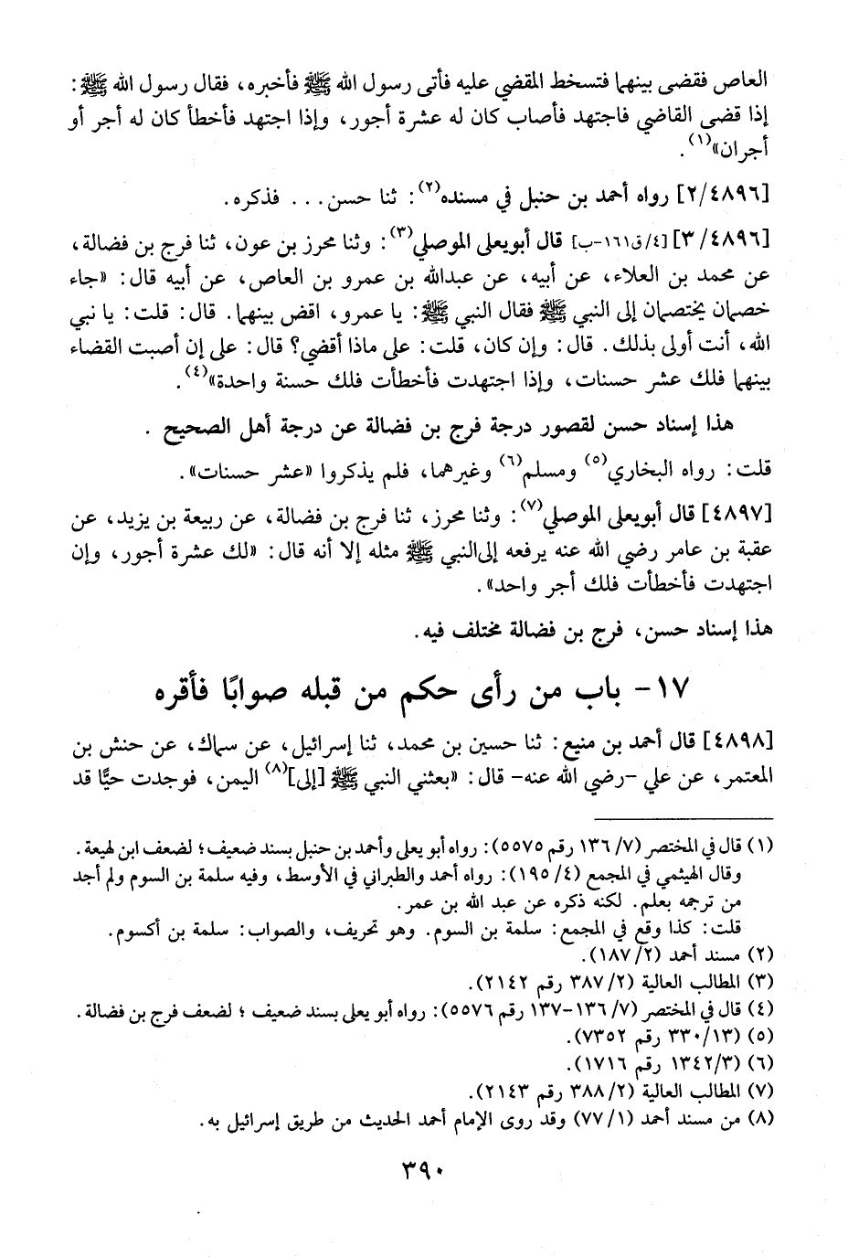 4896 / 3 - قَالَ أَبُو يَعْلَى الْمَوْصِلِيُّ: وَثَنَا مُحْرِزُ بْنُ عون، ثنا فرج بن فخصالة، عَنْ مُحَمَّدِ بْنِ الْعَلَاءِ، عَنْ أَبِيهِ، عْنَ عَبْدِ اللَّهِ بْنِ عْمَرِو بْنِ الْعَاصِ، عن أَبِيهِ قَالَ: "جَاءَ خَصْمَانِ يَخْتَصِمَانِ إِلَى النَّبِيِّ - صَلَّى اللَّهُ عَلَيْهِ وَسَلَّمَ - فَقَالَ النَّبِيُّ - صَلَّى اللَّهُ عَلَيْهِ وَسَلَّمَ -: يَا عَمْرُو، اقْضِ بَيْنَهُمَا. قَالَ: قُلْتُ: يَا نَبِيَّ اللَّهِ، أَنْتَ أَوْلَى بِذَلِكَ. قَالَ: وَإِنْ كَانَ، قُلْتُ: عَلَى مَاذَا أَقْضِي؟ قَالَ: عَلَى إِنْ أَصَبْتَ الْقَضَاءَ بَيْنَهُمَا فلك عشر حسنات، وإذا اجْتَهَدْتَ فَأَخْطَأْتَ فَلَكَ حَسَنَةٌ وَاحِدَةٌ".