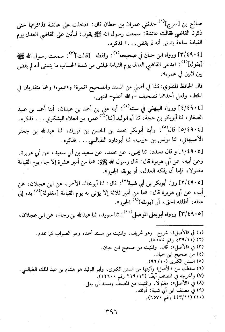 صالح بن سرج حَدَّثَنِي عِمْرَانُ بْنُ حِطَّانَ قَالَ: "دَخَلْتُ عَلَى عائشة فذاكرتها حتى ذكرنا القاضي فقال عائشة: سمعت رسول الله - صلى الله عليه وسلم - يَقُولُ: لَيَأْتِينَ عَلَى الْقَاضِي الْعَدْلِ يَوْمَ الْقِيَامَةِ سَاعَةٌ يَتَمَنَّى أَنَّهُ لَمْ يَقْضِ ... " فَذَكَرَهُ.