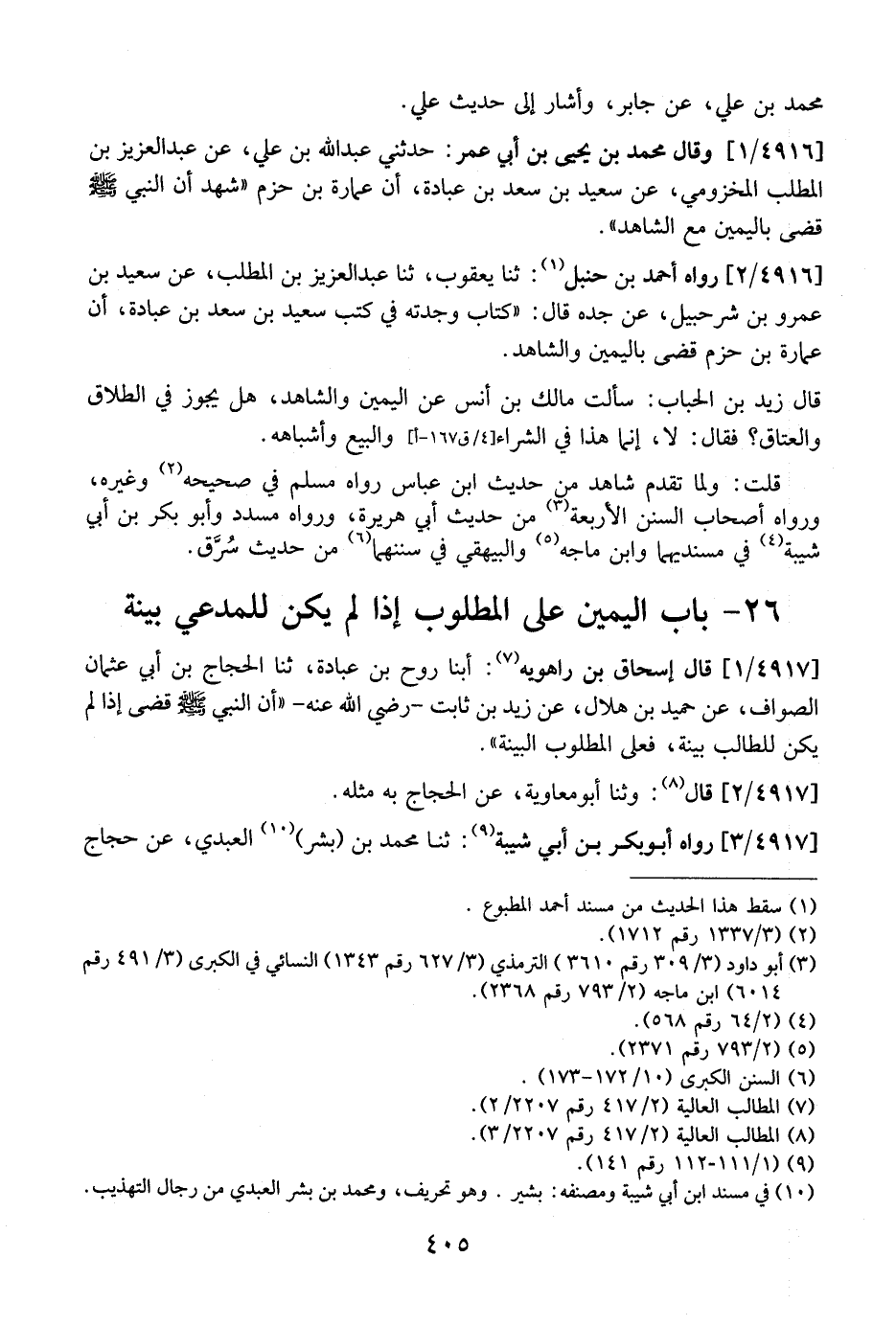 4917 / 1 - قَالَ إِسْحَاقُ بن راهويه: أبنا رَوْحُ بْنُ عُبَادَةَ، ثَنَا الْحَجَّاجُ بْنُ أَبِي عُثْمَانَ الصَّوَّافُ، عَنْ حُمَيْدِ بْنِ هِلَالٍ، عَنْ زَيْدِ بْنِ ثَابِتٍ- رَضِيَ اللَّهُ عَنْهُ- "أَنّ النَّبِيَّ - صَلَّى اللَّهُ عَلَيْهِ وَسَلَّمَ - قَضَى إِذَا لَمْ يَكُنْ لِلطَّالِبِ بَيِّنَةٌ، فَعَلَى الْمَطْلُوبِ الْبَيِّنَةُ".