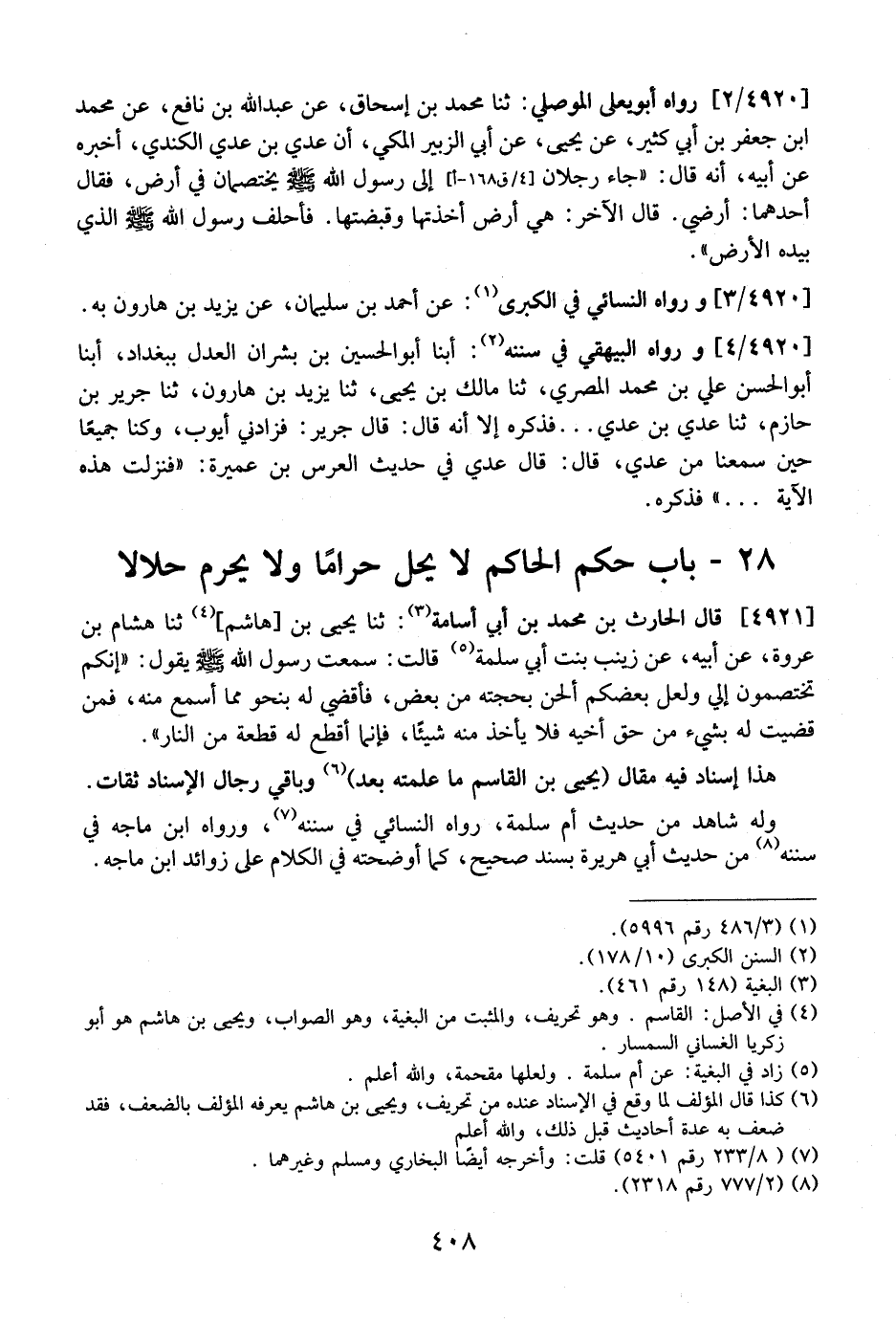 4921 - قَالَ الْحَارِثُ بْنُ مُحَمَّدِ بْنِ أَبِي أُسَامَةَ: ثَنَا يَحْيَى بْنُ هَاشِمٍ، ثَنَا هِشَامُ بْنُ عُرْوَةَ، عَنْ أَبِيهِ، عَنْ زَيْنَبَ بِنْتِ أَبِي سَلَمَةَ قَالَتْ: سَمِعْتُ رَسُولَ اللَّهِ - صَلَّى اللَّهُ عَلَيْهِ وسلم - يَقُولُ: "إِنَّكُمْ تَخْتَصِمُونَ إِلَيَّ وَلَعَلَّ بَعْضَكُمْ أَلْحَنُ بِحُجَّتِهِ مِنْ بَعْضٍ، فَأَقْضِيَ لَهُ بِنَحْوٍ مِمَّا أَسْمَعُ مِنْهُ، فَمَنْ قَضَيْتُ لَهُ بِشَيْءٍ مِنْ حَقِّ أَخِيهِ فَلَا يَأْخُذْ مِنْهُ شَيْئًا، فَإِنَّمَا أَقْطَعُ لَهُ قِطْعَةً مِنَ النَّارِ".