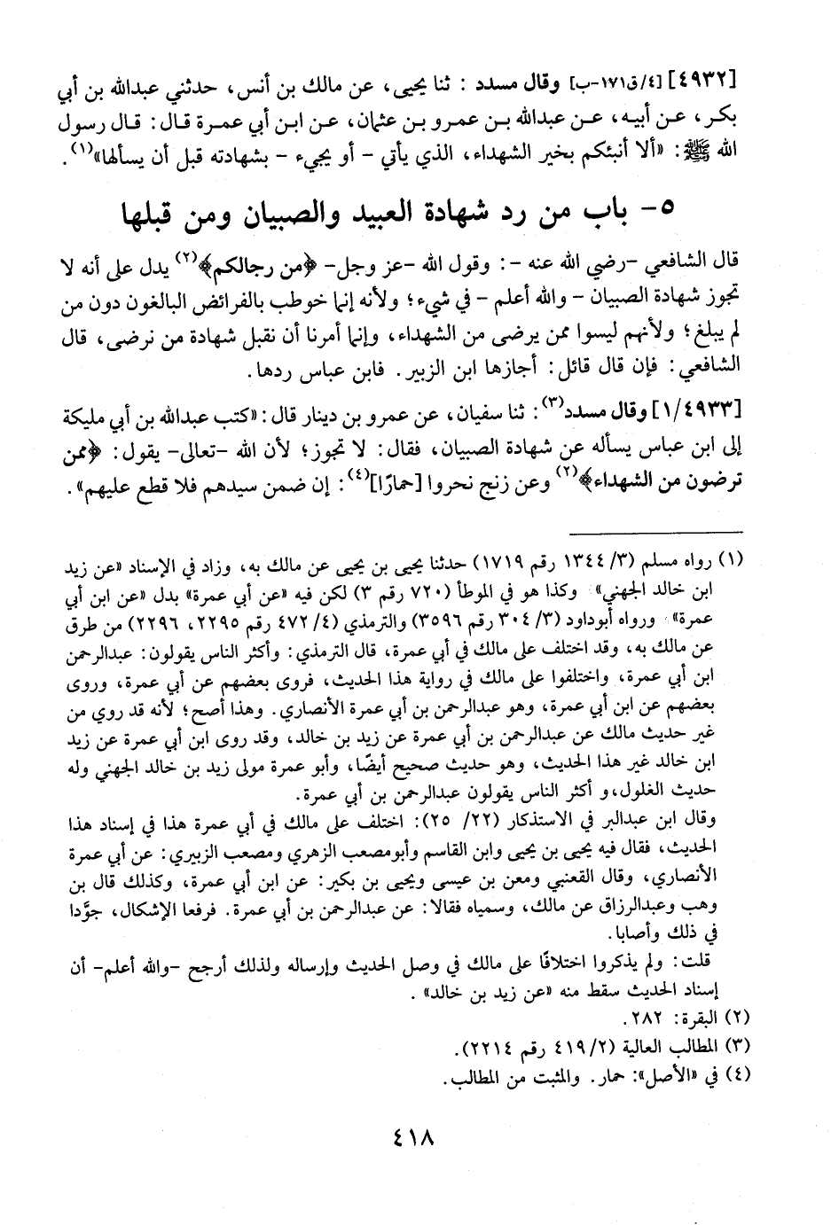 4932 - وَقَالَ مُسَدَّدٌ: ثَنَا يَحْيَى، عَنْ مَالِكِ بْنِ أَنَسٍ، حَدَّثَنِي عَبْدِ اللَّهِ بْنِ أَبِي بَكْرٍ، عَنْ أَبِيهِ، عَنْ عَبْدِ اللَّهِ بْنِ عَمْرٍو بْنِ عُثْمَانَ، عَنِ ابْنِ أَبِي عَمْرَةَ قَالَ: قَالَ رَسُولُ اللَّهِ - صَلَّى اللَّهُ عَلَيْهِ وسلم -: أَلَا أُنَبِّئُكُمْ بِخَيْرِ الشُّهَدَاءِ، الَّذِي يَأْتِي- أَوْ يجيء- بشهادته قَبْلَ أَنْ يُسْأَلَهَا".