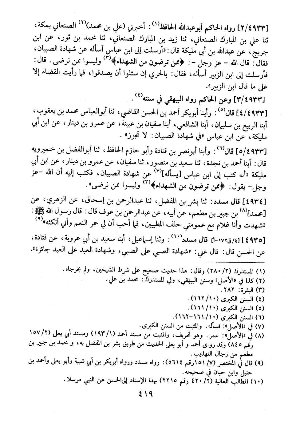 4933 / 2 - رَوَاهُ الْحَاكِمُ أَبُو عَبْدِ اللَّهِ الْحَافِظُ: أَخْبَرَنِي (عَلِيُّ بْنُ مُحَمَّدٍ) الصَّنْعَانِيُّ بِمَكَّةَ، ثَنَا عَلِيُّ بْنُ الْمُبَارَكِ الصَّنْعَانِيُّ، ثَنَا زَيْدُ بْنُ الْمُبَارَكِ الصَّنْعَانِيُّ، ثَنَا مُحَمَّدُ بْنُ ثَوْرٍ، عَنِ ابْنُ جُرَيْجٍ، عَنْ عَبْدِ اللَّهِ بْنِ أَبِي مُلَيْكَةَ قَالَ: "أَرْسَلْتُ إِلَى ابْنِ عَبَّاسٍ أَسْأَلُهُ عَنْ شَهَادَةِ الصِّبْيَانِ، فَقَالَ: قَالَ اللَّهُ- عَزَّ وَجَلَّ-: {ممن ترضون من الشهداء} وَلَيْسُوا مِمَّنْ نَرْضَى. قَالَ: فَأَرْسَلْتُ إِلَى ابْنِ الزُّبَيْرِ أَسْأَلُهُ، فَقَالَ: بِالْحَرِيِّ إِنْ سُئِلُوا أَنْ يُصَدَّقُوا، فَمَا رَأَيْتُ الْقَضَاءَ إِلَّا عَلَى مَا قَالَ ابْنُ الزُّبَيْرِ".