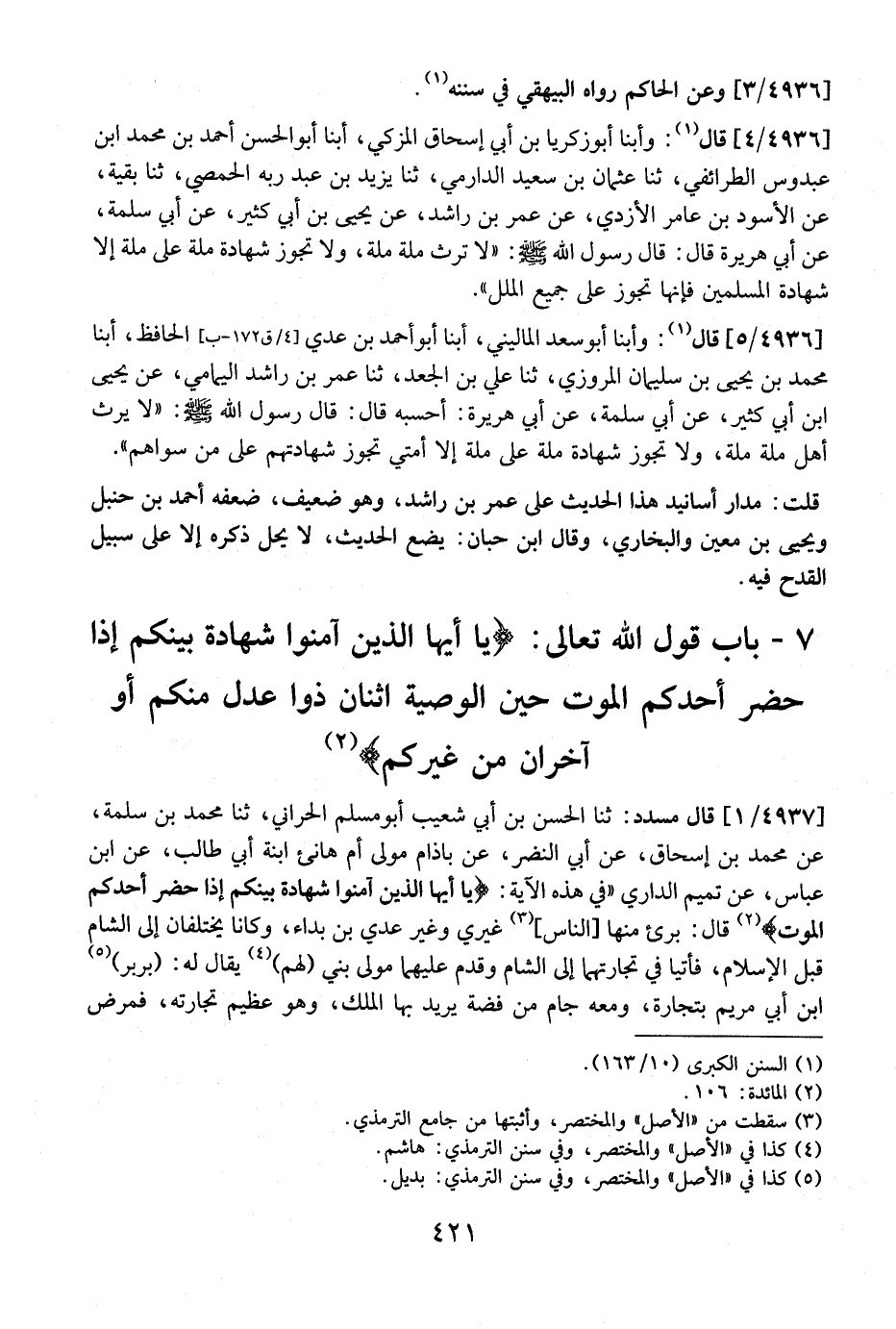 4937 / 1 - قَالَ مُسَدَّدٌ: ثَنَا الْحَسَنُ بْنُ أَبِي شُعَيْبٍ أَبُو مُسْلِمٍ الْحَرَّانِيُّ، ثَنَا مُحَمَّدُ بْنُ سَلَمَةَ، عَنْ مُحَمَّدِ بْنِ إِسْحَاقَ، عَنْ أَبِي النَّضْرِ، عَنْ بَاذَامٍ مَوْلَى أُمِّ هَانِئٍ ابْنَةِ أَبِي طالمب، عَنِ ابْنِ عَبَّاسٍ، عَنْ تَمِيمٍ الدَّارِيِّ "فِي هذه الآية: {يا أيها الَّذِينَ آمَنُوا شَهَادَةُ بَيْنِكُمْ إِذَا حَضَرَ أَحَدَكُمُ الموت} قال: برئ منها الناس غَيْرِي وَغَيْرُ عَدِيِّ بْنِ بَدَاءَ، وَكَانَا يَخْتَلِفَانِ إِلَى الشَّامِ قَبْلَ الْإِسْلَامِ، فَأَتَيَا فِي تِجَارَتِهِمَا إلى الشام وقدم عليهما مولى بني الهم) يقال له: (بربر) ابن أَبِي مَرْيَمَ بِتِجَارَةٍ، وَمَعَهُ جَامٌ مِنْ فِضَّةٍ يريد بها الْمَلِكُ، وَهُوَ عَظِيمٌ تِجَارَتُهُ، فَمَرِضَ