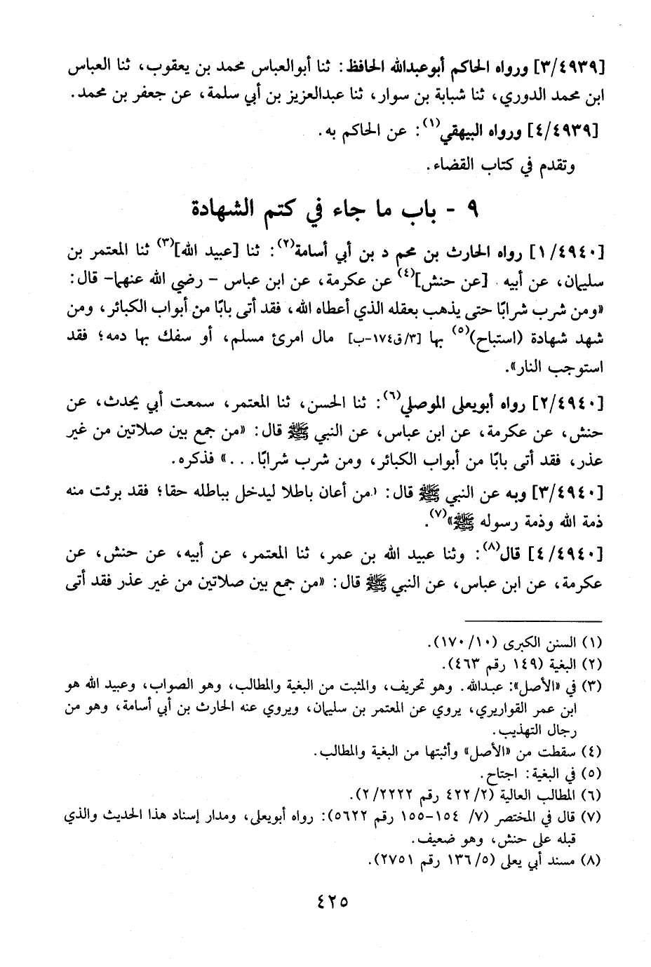 4940 / 1 - رواه الحارث بن محم د بْنِ أَبِي أُسَامَةَ: ثَنَا عُبَيْدُ اللَّهِ، ثَنَا الْمُعْتَمِرُ بْنُ سُلَيْمَانَ، عَنْ أَبِيهِ عَنْ حَنَشٍ، عَنْ عِكْرِمَةَ، عَنِ ابْنِ عَبَّاسٍ- رَضِيَ اللَّهُ عَنْهُمَا- قَالَ: "وَمَنْ شَرِبَ شَرَابًا حَتَّى يَذْهَبَ بِعَقْلِهِ الَّذِي أَعْطَاهُ اللَّهُ، فَقَدْ أَتَى بَابًا مِنْ أبو اب الْكَبَائِرِ، وَمَنْ شَهِدَ شَهَادَةً (اسْتَبَاحَ) بِهَا مَالَ امْرِئٍ مُسْلِمٍ، أَوْ سَفَكَ بِهَا دَمَهُ؟ فَقَدْ اسْتَوْجَبَ النَّارَ".