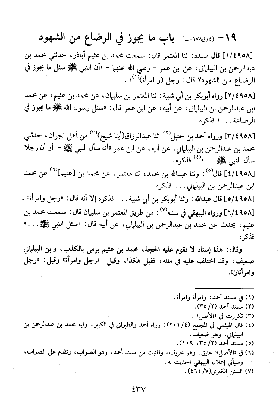 4958 / 1 - قَالَ مُسَدَّدٌ: ثَنَا الْمُعْتَمِرُ قَالَ: سَمِعْتُ مُحَمَّدَ بن عثيم أباذر، حَدَّثَنِي مُحَمَّدُ بْنُ عَبْدِ الرَّحْمَنِ بْنِ الْبَيْلَمَانِيِّ، عَنِ ابْنِ عُمَرَ- رَضِيَ اللَّهُ عَنْهُمَا- "أَنّ النَّبِيَّ - صَلَّى اللَّهُ عَلَيْهِ وَسَلَّمَ - سُئِلَ مَا يَجُوزُ فِي الرَّضَاعِ مِنَ الشُّهُودِ؟ قَالَ: رَجُلٌ (وَامْرَأَةٌ) ".