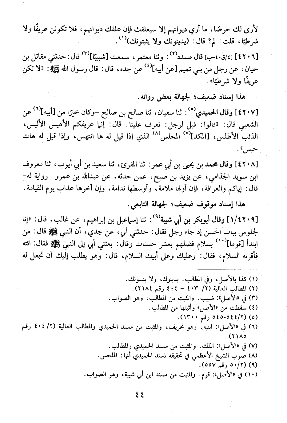 4206 - قال مسدد: وثنا معتمر، سَمِعْتُ شَبِيبًا، قَالَ: حَدَّثَنِي مقاتلَ بْنُ حَيَّانَ، عَنْ رَجُلٍ مِنْ بَنِي تَمِيمٍ عَنْ أَبِيهِ، عَنْ جَدِّهِ، قَالَ: قَالَ رَسُولُ اللَّهِ - صَلَّى اللَّهُ عَلَيْهِ وَسَلَّمَ -: لَا تَكُنْ عَرِّيفًا وَلَا شُرَطِيًّا".