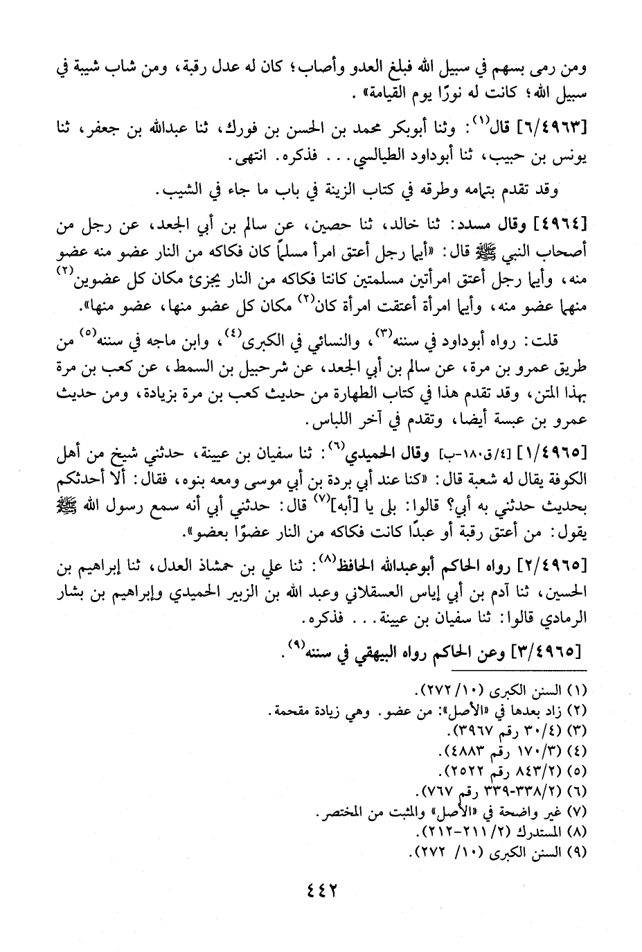 4965 / 1 - وَقَالَ الْحُمَيْدِيُّ: ثَنَا سُفْيَانُ بْنُ عُيَيْنَةَ، حَدَّثَنِي شَيْخٌ مِنْ أَهْلِ الْكُوفَةِ يُقَالُ لَهُ شُعْبَةُ قَالَ: "كُنَّا عِنْدَ أَبِي بُرْدَةَ بْنِ أَبِي مُوسَى وَمَعَهُ بَنُوهُ، فَقَالَ: أَلَا أُحَدِّثُكُمْ بِحَدِيثٍ حَدَّثَنِي بِهِ أَبِي؟ قَالُوا: بَلَى يَا أَبَةِ، قَالَ: حَدَّثَنِي أَبِي أَنَّهُ سَمِعَ رَسُولَ اللَّهِ - صَلَّى اللَّهُ عَلَيْهِ وسلم - يقول: من أعتق رقبة أو عبد كَانَتْ فَكَاكَهُ مِنَ النَّارِ عُضْوًا بِعُضْوٍ".