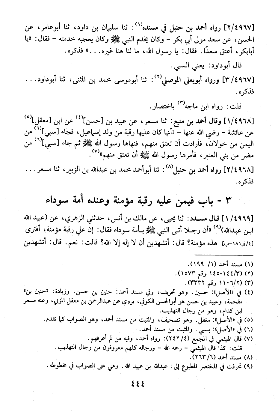 4969 / 1 - قَالَ مُسَدَّدٌ: ثَنَا يَحْيَى، عَنْ مَالِكِ بْنِ أَنَسٍ، حَدَّثَنِي الزُّهْرِيُّ، عن (عبيد الله ابن عَبْدِ اللَّهِ) "أَنَّ رَجُلًا أَتَى النَّبِيَّ - صَلَّى اللَّهُ عَلَيْهِ وَسَلَّمَ - بِأَمَةٍ سَوْدَاءَ فَقَالَ: إِنَّ عَلَيَّ رَقَبَةً مُؤْمِنَةً، أَفَتَرَى هَذِهِ مُؤْمِنَةً؟ قَالَ: أتشهدين أَنْ لَا إِلَهَ إِلَّا اللَّهُ؟ قَالَ: نَعَمْ. قَالَ: أتشهدين