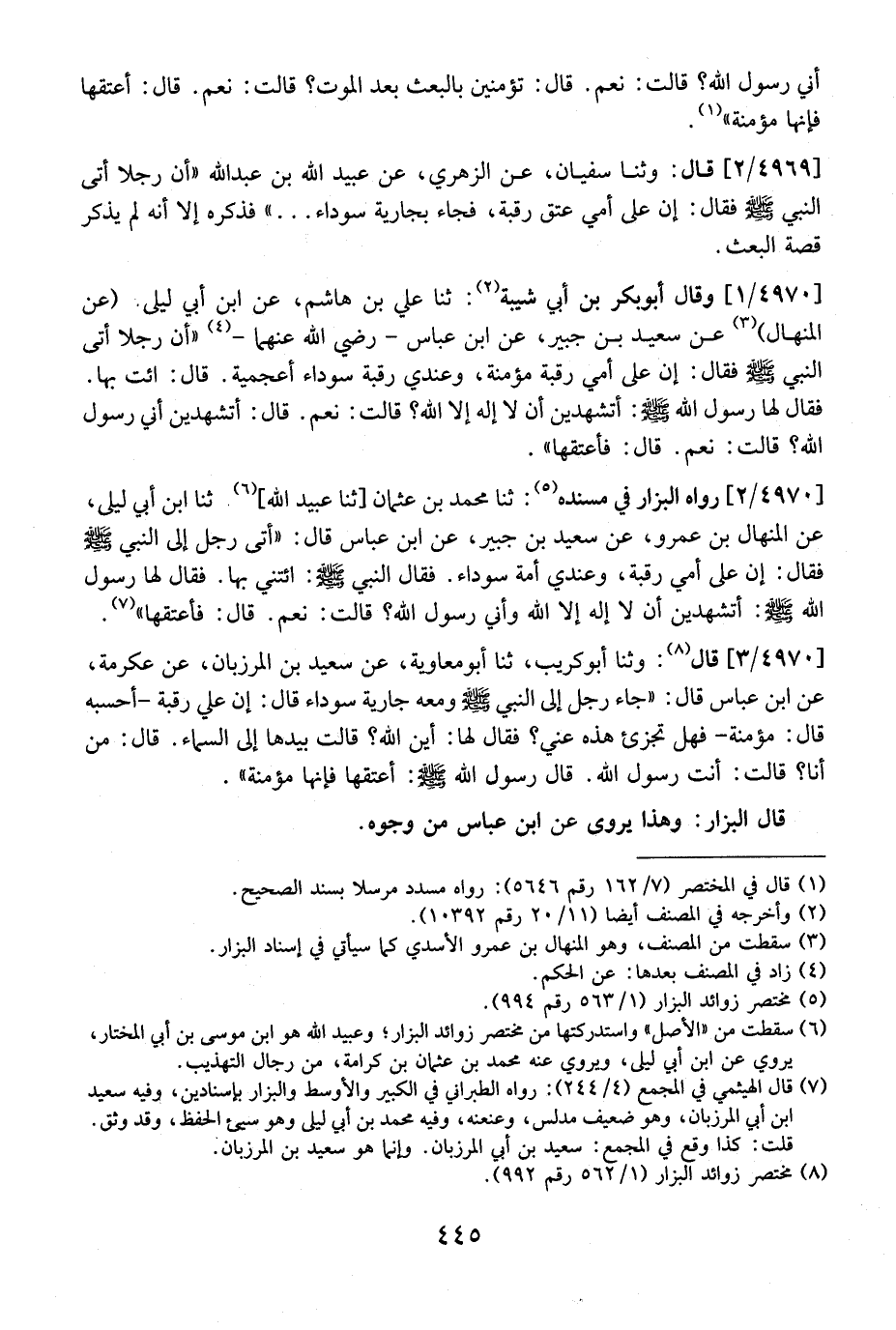 4970 / 1 - وَقَالَ أَبُو بَكْرِ بْنُ أَبِي شَيْبَةَ: ثنا عَلِيُّ بْنُ هَاشِمٍ، عَنِ ابْنِ أَبِي لَيْلَى (عن المنهال) عن سعيلى بْنِ جُبَيْرٍ، عَنِ ابْنِ عَبَّاسٍ- رَضِيَ اللَّهُ عَنْهُمَا- "أَنَّ رَجُلًا أَتَى النَّبِيَّ - صَلَّى اللَّهُ عَلَيْهِ وَسَلَّمَ - فَقَالَ: إِنَّ عَلَى أُمِّي رَقَبَةً مُؤْمِنَةً، وَعِنْدِي رَقَبَةٌ سَوْدَاءُ أَعْجَمِيَّةٌ. قَالَ: ائْتِ بِهَا. فَقَالَ لَهَا رَسُولُ اللَّهِ - صَلَّى اللَّهُ عَلَيْهِ وَسَلَّمَ -: أَتَشْهَدِينَ أَنْ لَا إِلَهَ إِلَّا اللَّهُ؟ قَالَ: نَعَمْ. قَالَ: أتشهدين أني رسول الله؟ قَالَتْ: نَعَمْ. قَالَ: فَأَعْتِقْهَا".