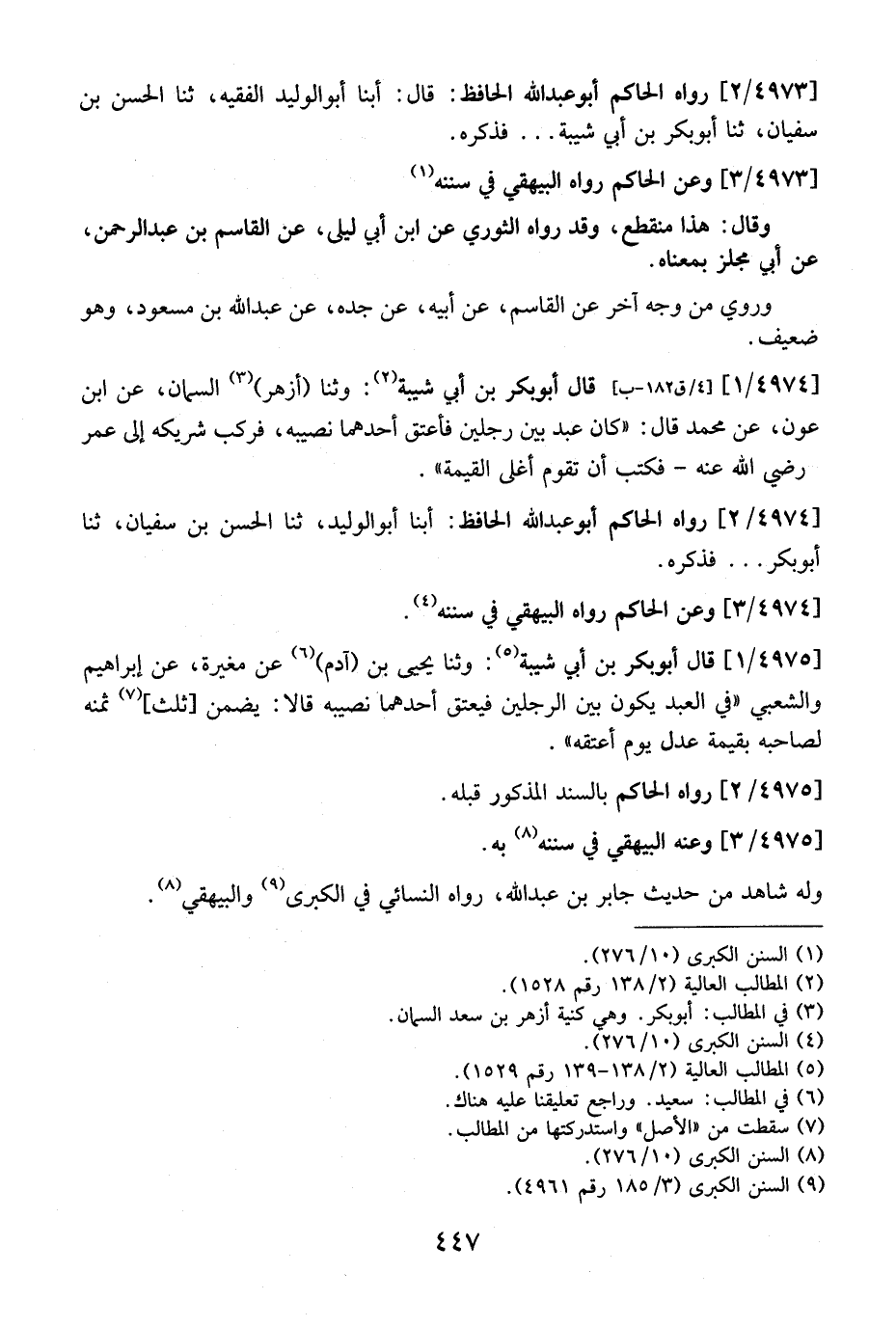 4975 / 1 - قَالَ أَبُو بَكْرِ بْنُ أَبِي شَيْبَةَ: وَثَنَا يَحْيَى بْنُ آدَمَ عَنْ مُغِيرَةَ، عَنْ إِبْرَاهِيمَ وَالشَّعْبِيِّ "في العبد يكون بين الرجلين فيعتق أحدهما نصيبه قالا: يضمن ثلث ثَمَنَهُ لِصَاحِبِهِ بِقِيمَةٍ عِدْلِ يَوْمَ أَعْتَقَهُ".